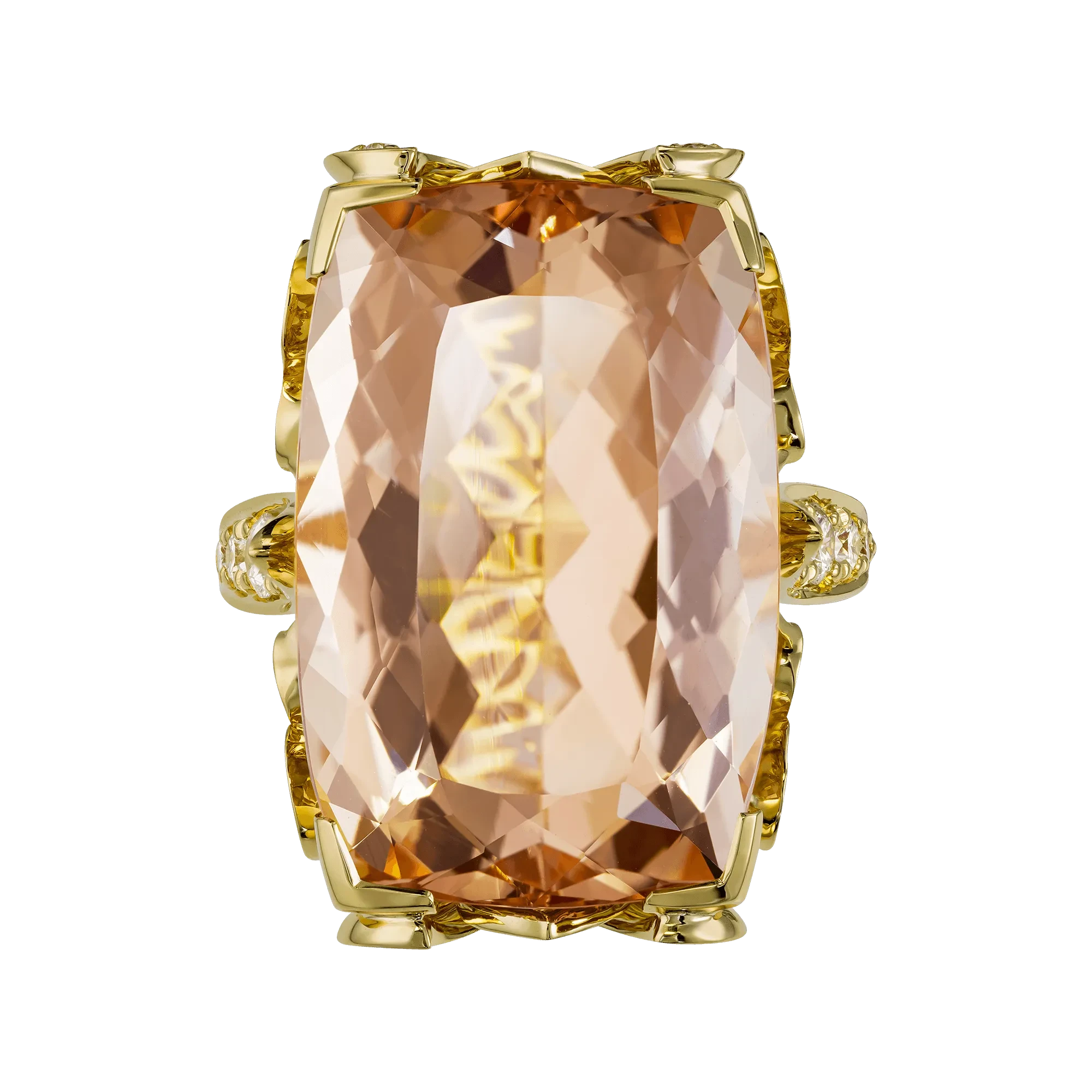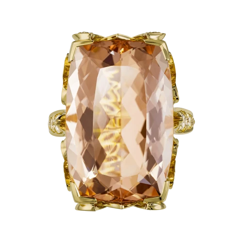 В центре композиции – морганит из Бразилии весом 27,34 карата, один из самых чувственных представителей семейства бериллов. Этот драгоценный камень ценится за свой утончённый розово-персиковый оттенок, символизирующий нежность и искренние чувства. Благодаря природной прозрачности и редкому внутреннему свечению морганит создаёт впечатление, будто в нём заключено само тепло прикосновения.