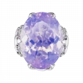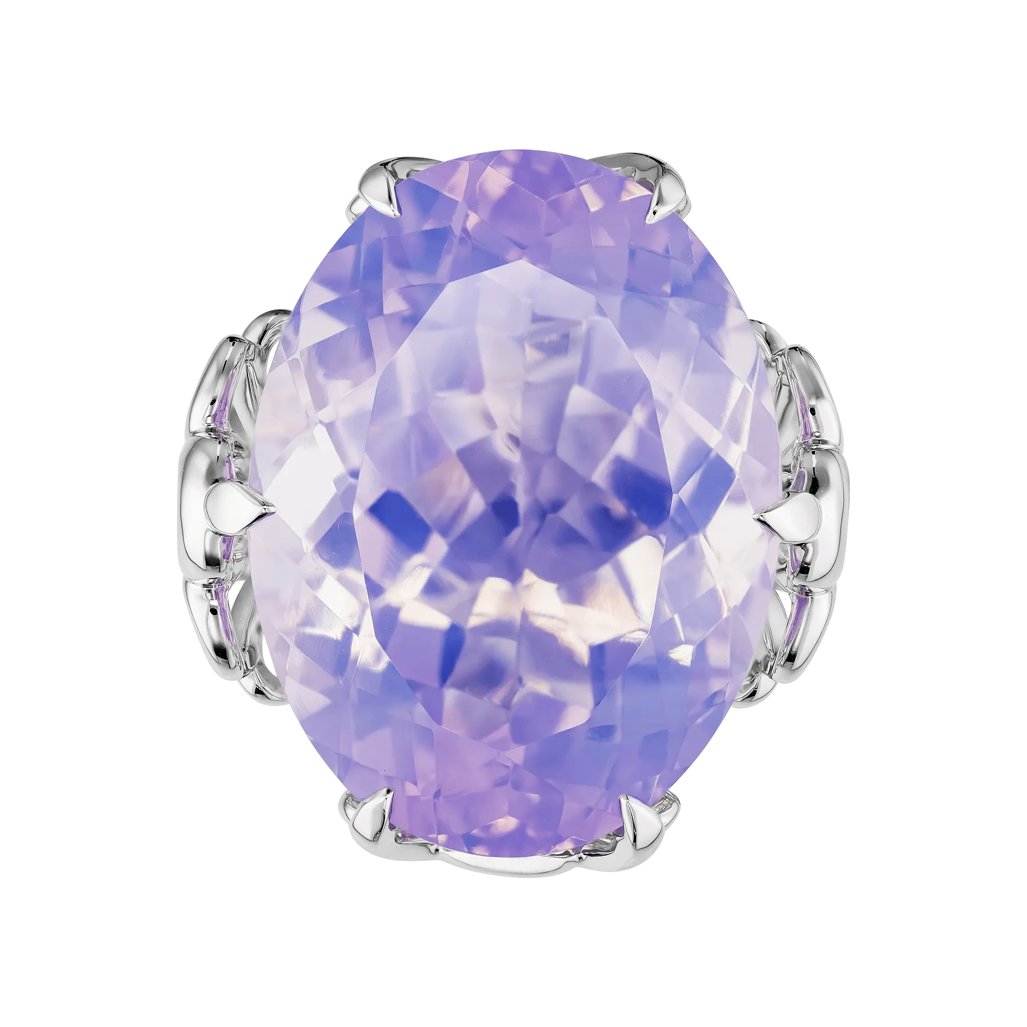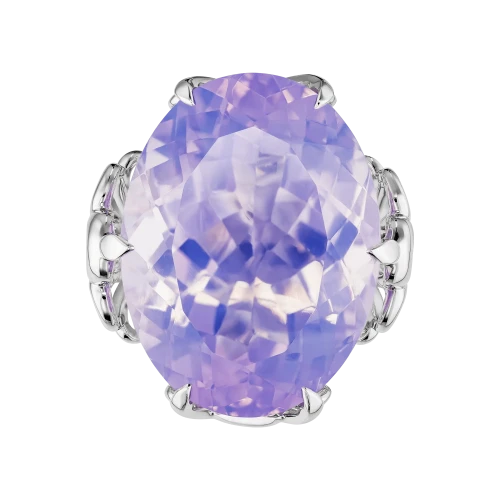 Центральный камень раскрывает светлую сиреневую гамму с холодными, почти воздушными нюансами, которые ценятся значительно выше насыщенных фиолетовых тонов за их чистоту и сложность восприятия. Высокая прозрачность позволяет свету свободно проходить сквозь кристалл, не задерживаясь на поверхности, а наполняя его изнутри мягким, равномерным сиянием. Огранка усиливает этот эффект, направляя блики и создавая ощущение текучего, живого света.