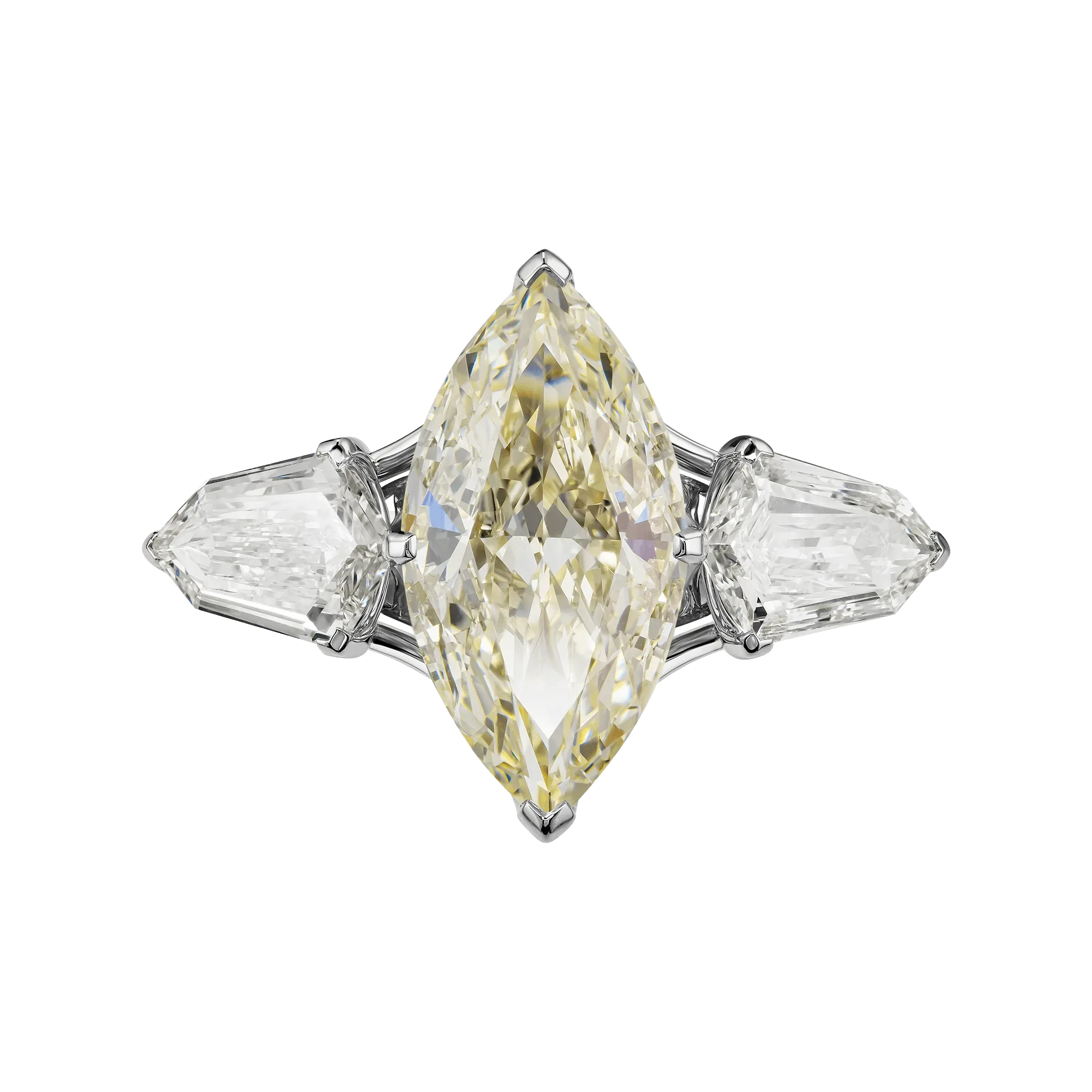 По обе стороны расположены драгоценные спутники – крупные бриллианты фантазийной огранки, чьё сверкание усиливает выразительность главного камня. Их кристальная чистота рождает игру света, подобную движению звёзд в небесной бездне.