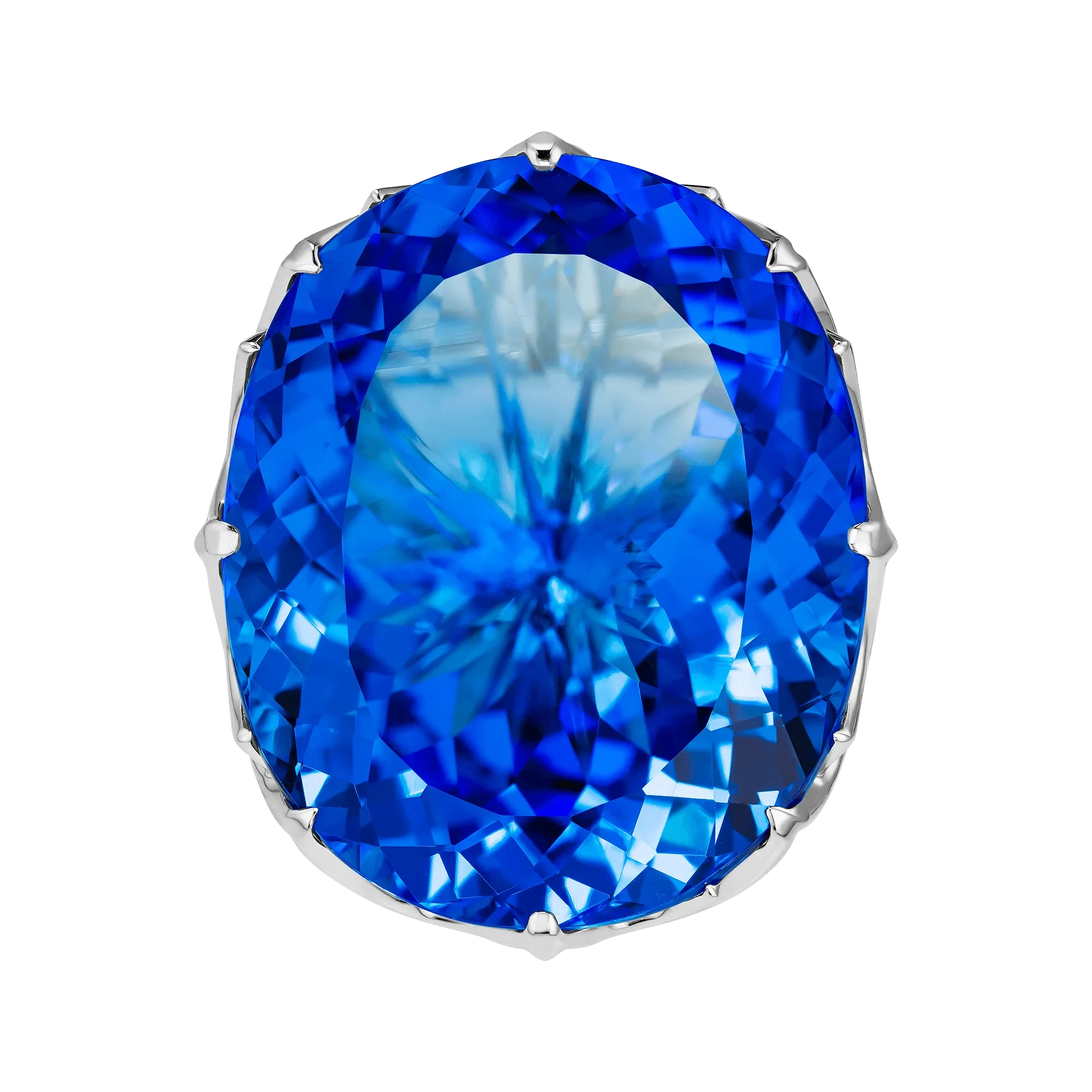 В центре композиции сияет топаз редчайшего оттенка Super Swiss, добытый в Бразилии. Его глубокий цвет с оттенками индиго напоминает прозрачные глубины южных морей, где солнце танцует на волнах, а каждый луч проникает в само сердце океана. Природный камень словно живёт, переливаясь десятками оттенков – от утренней лазури до густого синего заката.