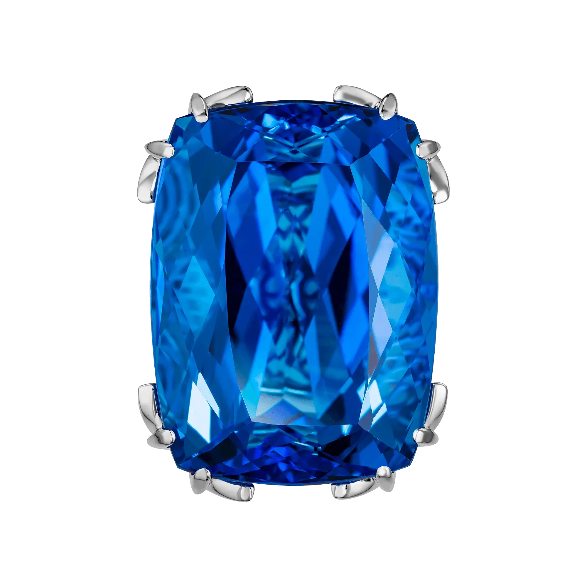 В его сердце сияет крупный топаз редчайшего оттенка Super Swiss весом 79,94 карата, добытый на Шри-Ланке – острове, где небо словно отражается в воде. Драгоценный камень будто хранит дыхание моря: внутри него мерцают струи света, переливающиеся от лазурного до глубокого индиго. Каждый поворот кристалла рождает новую волну цвета – как если бы само море дышало в ладонях.