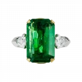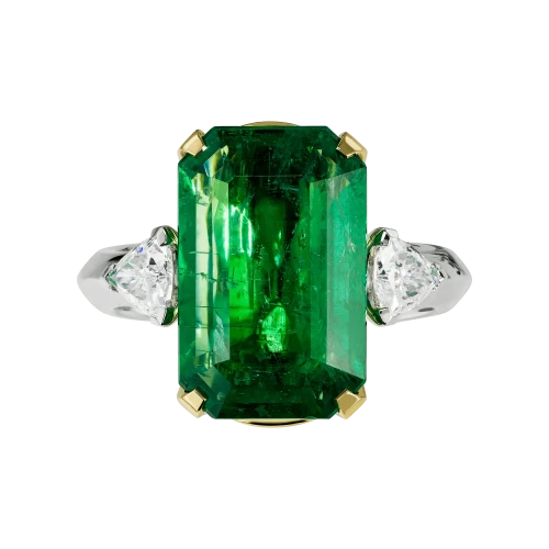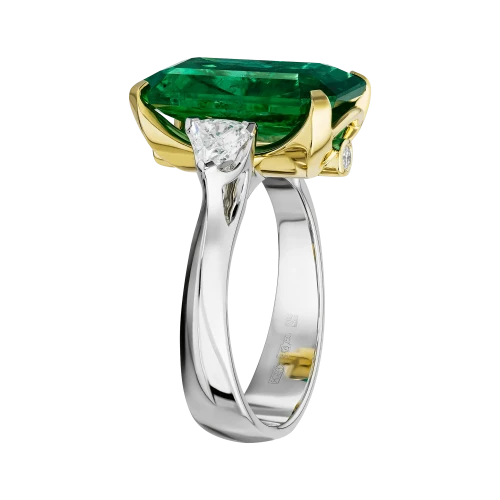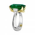 Жёлтая оправа центрального камня подчёркивает глубину его оттенка и усиливает ощущение тепла, тогда как основная часть кольца выполнена из белого золота, формирующего выверенный контраст между изумрудом и бриллиантами-спутниками. Их холодное сияние задаёт чёткую архитектуру формы и придаёт композиции равновесие и завершённость.
