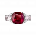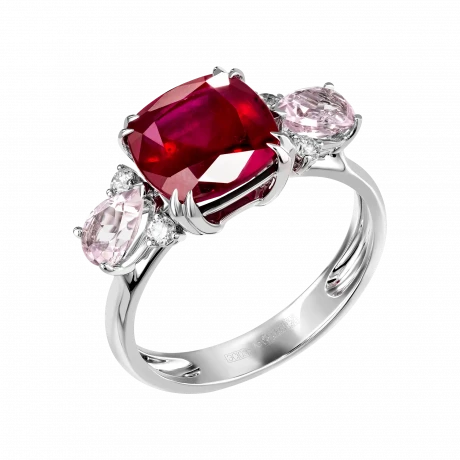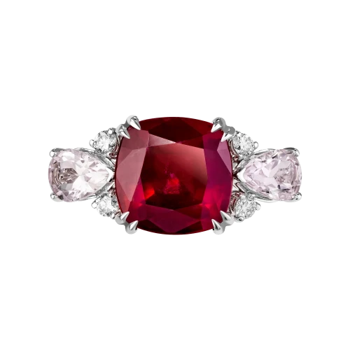 Обозначив насыщенный цвет и чистоту центрального самоцвета весом почти в четыре карата как главные приоритеты, ювелиры виртуозно добавили в композицию бриллианты и морганиты. Нежный розовый блеск последних и полная прозрачность кристаллов первого порядка оттеняют багряные переливы рубина, готового сопровождать владелицу во всех ее начинаниях и делиться с ней своей уникальной энергетикой.