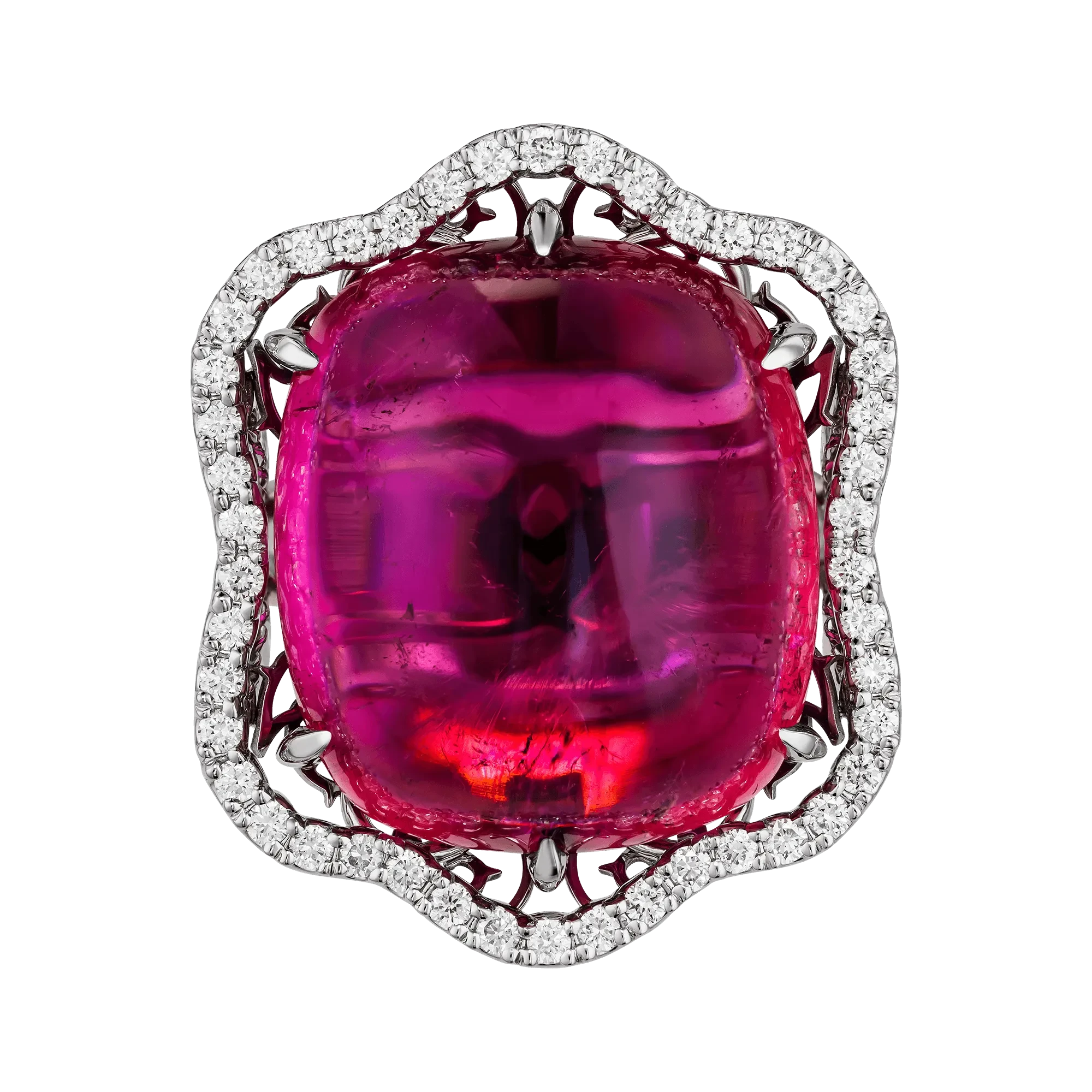 Ажурная оправа из белого золота придаёт композиции архитектурную лёгкость, а рассыпь бриллиантов вокруг камня подчеркивает его динамичную природу. Блестящие акценты усиливают мерцание турмалина, словно визуализируя ритм вдохновения, в котором рождается красота.