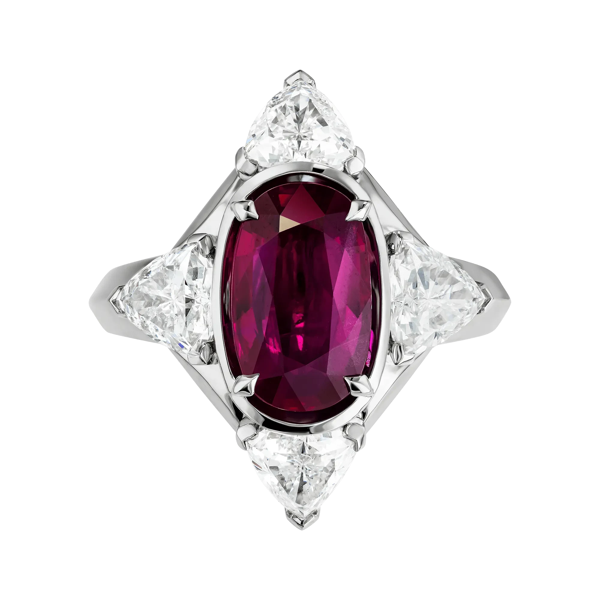Оправа из белого золота решена в форме четырёхконечной звезды. Крупные бриллианты нетривиальной огранки образуют световую геометрию вокруг центрального камня, усиливая его насыщенность и подчёркивая глубину оттенка. Холодное сияние бриллиантов создаёт контраст, благодаря которому рубин словно загорается ещё ярче, становясь истинной «вечерней звездой» композиции.