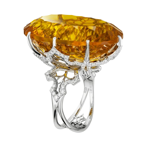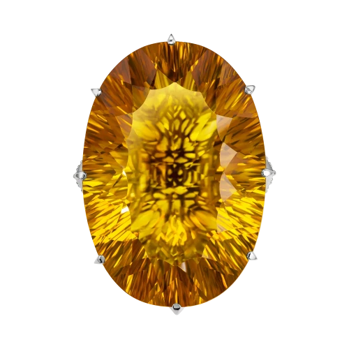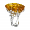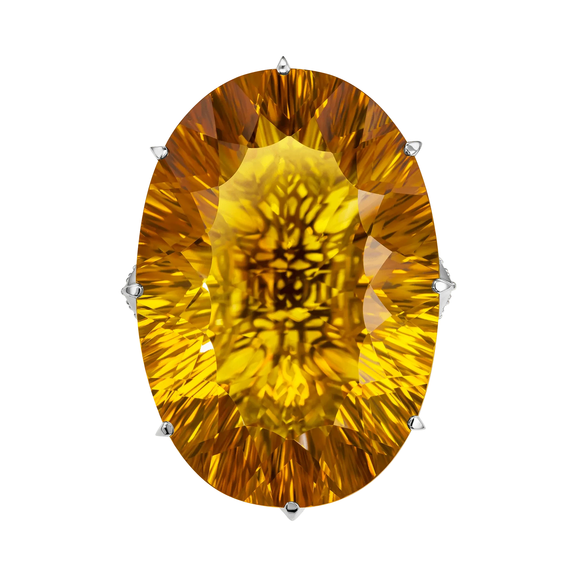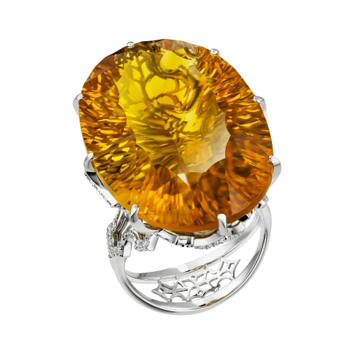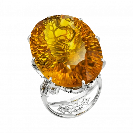В центре композиции – бразильский цитрин весом 48,14 карата, вобравший палитру уходящего солнца. Его оттенок – золотисто-медовый, с живыми отблесками янтаря – будто отражает мгновение, когда осень достигает своей кульминации.