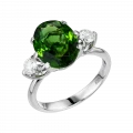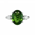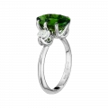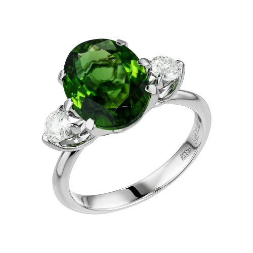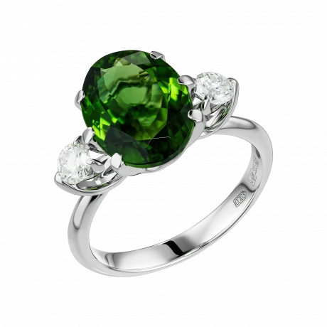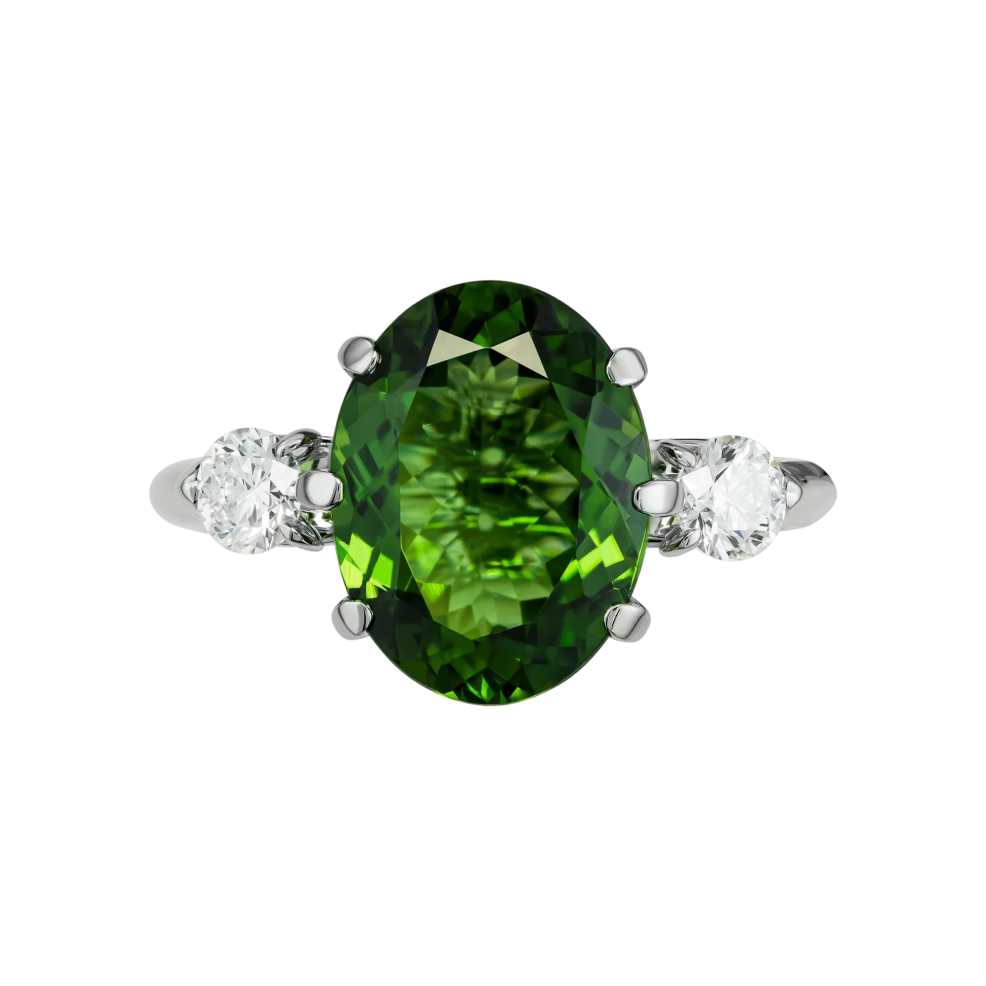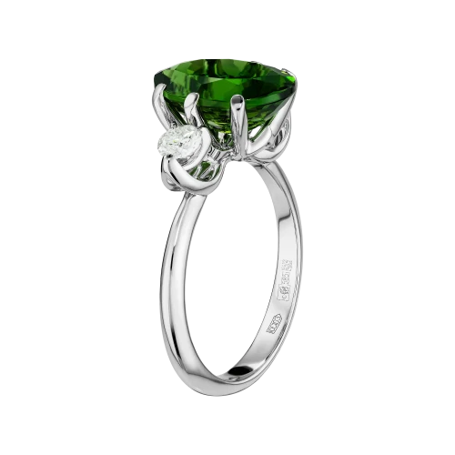 В центре композиции — хромтурмалин, одна из редчайших разновидностей турмалина, ценимая в профессиональной среде за насыщенный зелёный тон, обусловленный присутствием ионов хрома. В отличие от изумруда, его цвет лишён мягкости — он плотный, концентрированный, с холодной прозрачностью и характерным внутренним свечением, проявляющимся при изменении угла света. Такой самоцвет встречается значительно реже классических зелёных турмалинов и относится к категории коллекционных камней.