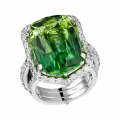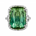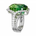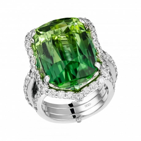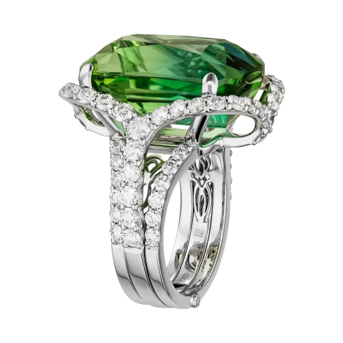 В центре композиции сияет редкий зелёный турмалин весом 24,10 карата, добытый в Конго – земле, где рождаются самые крупные и чистые кристаллы. Его уникальная игра оттенков создаёт иллюзию движения: от насыщенного изумрудного до светлого, почти прозрачного жёлто-зелёного – как если бы в камне застыл живой свет тропического солнца.