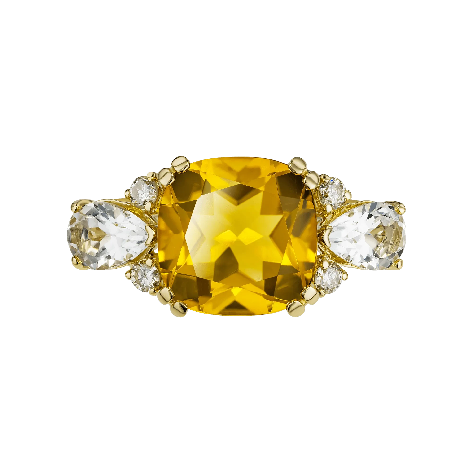 В кольце «Высшая нота» центральный цитрин звучит как чистый, уверенный аккорд — тот самый световой тон, который определяет всю композицию. Его насыщенный медово-золотой оттенок, рождённый под бразильским солнцем, создаёт ощущение объёмного, тёплого сияния, будто заключённого в идеально огранённом кристалле.