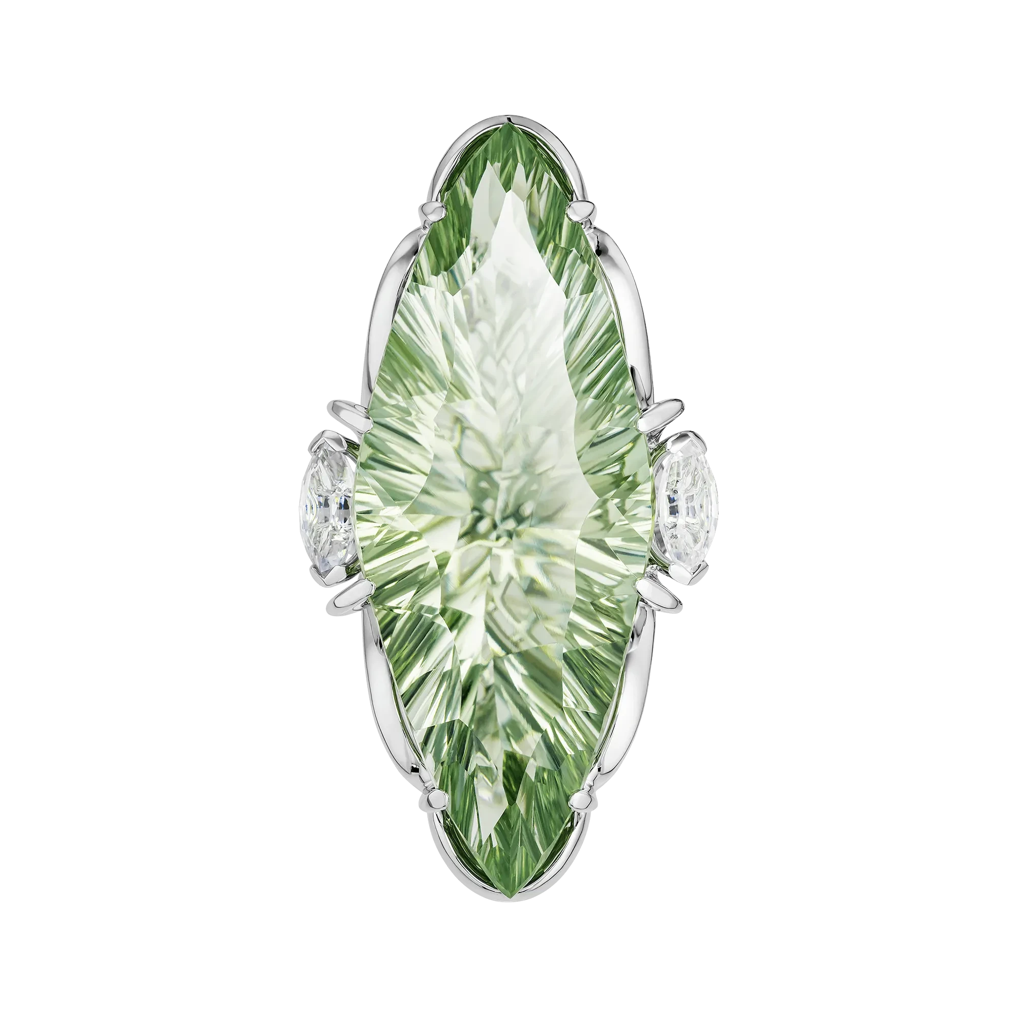В авторском кольце «Высшая прозрачность» мастера Maxim Demidov доводят идею света до предельной чистоты формы. Композиция построена вокруг крупного бразильского празиолита весом 24,17 карата, огранённого в изящную форму «маркиза», которая придаёт украшению динамику и вытянутую элегантность.