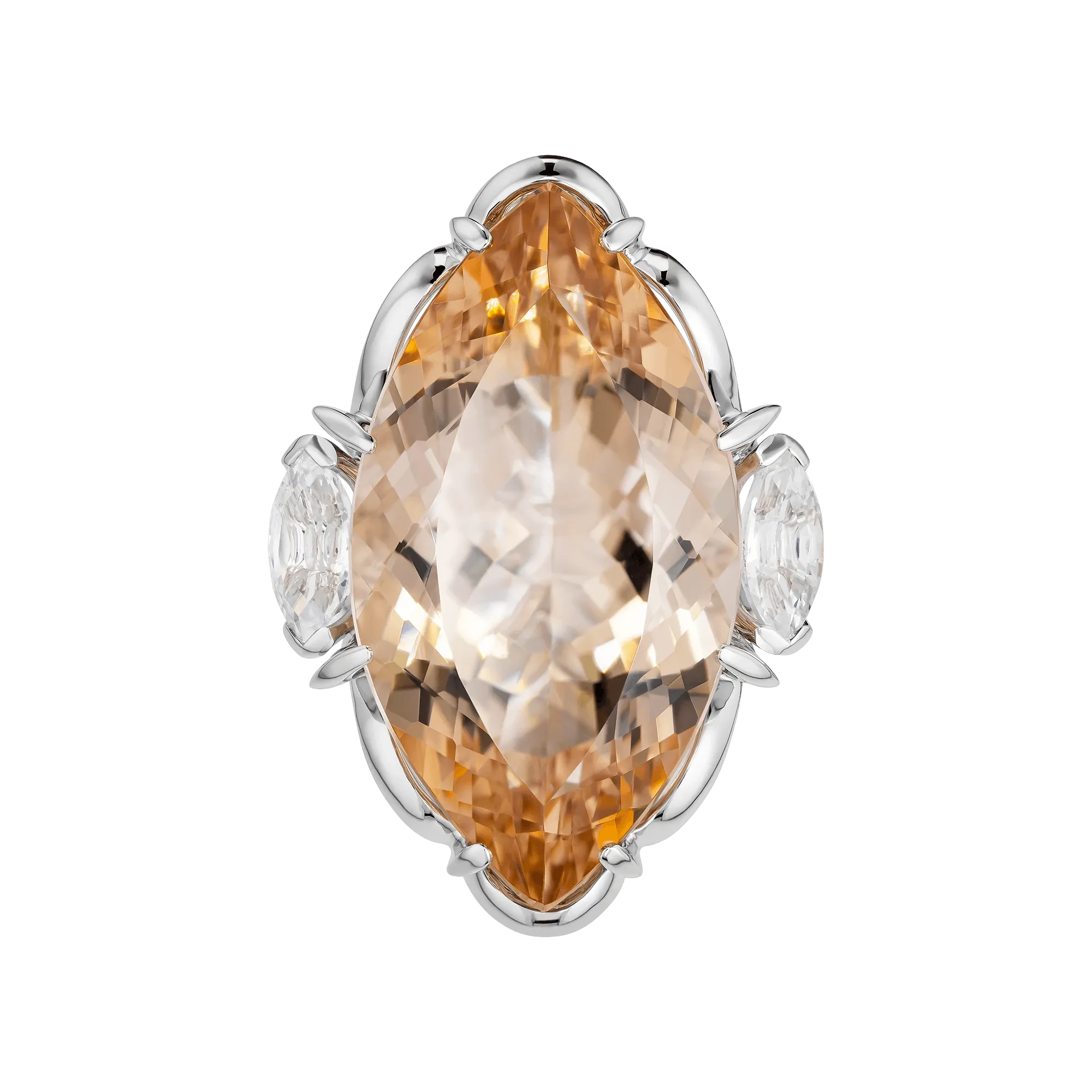 Два бесцветных сапфира, расположенные по обе стороны от центрального камня, выступают не просто акцентами, а структурными опорами композиции. Их холодная ясность подчёркивает мягкость морганита, создавая контраст, который усиливает выразительность цвета. Оправа из белого золота выстроена с архитектурной точностью: линии повторяют контур самоцвета, удерживая крупный минерал в пространстве с лёгкостью и достоинством.