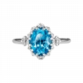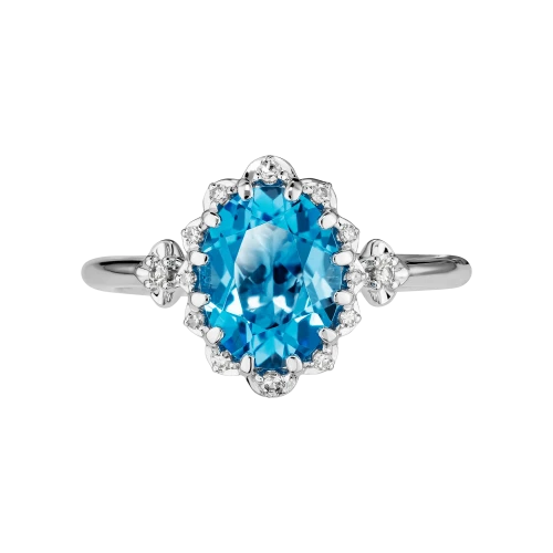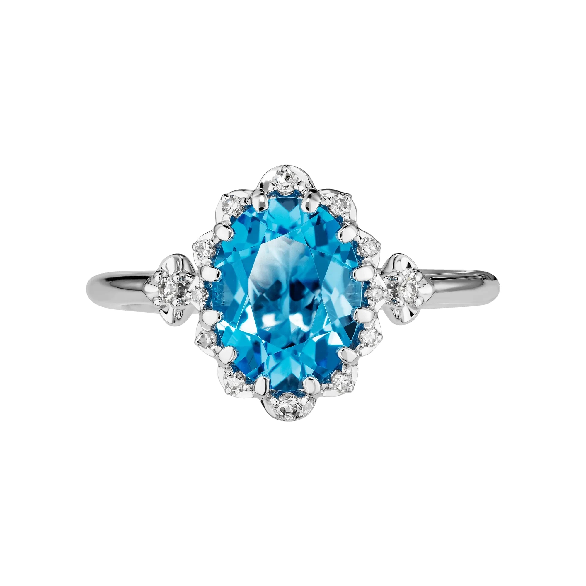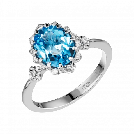 В центре кольца сияет овальный голубой топаз – прозрачный, как капля небесной росы. Его нежный и насыщенный оттенок создаёт ощущение прохладной глубины, полной внутреннего света. Благодаря огранке и высокой чистоте, самоцвет излучает сияние, которое наполняет кольцо живой энергией. Вокруг – ореол из бриллиантов, будто отблески света, отражённые на водной глади. Белое золото оправы образует тонкую и изящную линию, обнимающую природный камень с невесомой деликатностью.