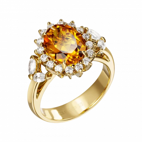 Очаровательное кольцо создано в духе особенных изящных украшений, пронизанных позитивным настроением. Своим шармом элегантная драгоценность обязана не только насыщенному по оттенку солнечному минералу весом 2,20 карат, добытому в восхитительно веселой стране Бразилии, но и многочисленным бриллиантам и сапфирам.