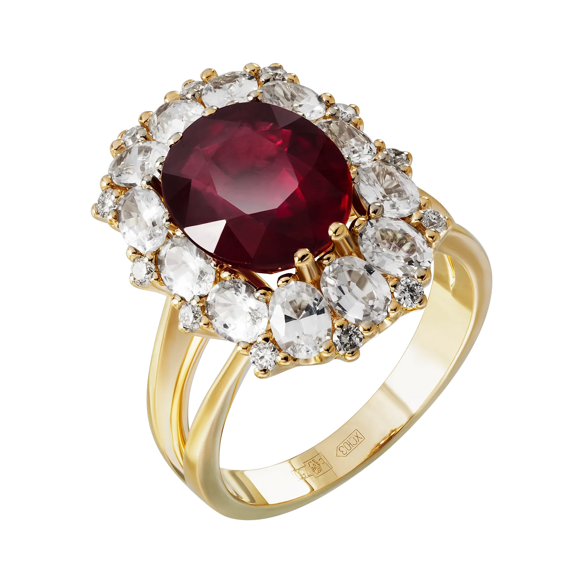 Главным огненным знаком головокружительного кольца стал фантастический крупный рубин, «дышащий» силой. Переливаясь в лучах света, чистейший мозамбикский самоцвет весом 3,74 карата, в гармоничном симбиозе с бриллиантовым и сапфировыми всполохами, едва сдерживаемыми филигранной оправой из желтого золота, демонстрирует величие своего пламенного духа, принесшего ему славу драгоценного символа страсти.