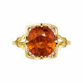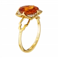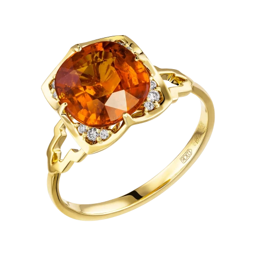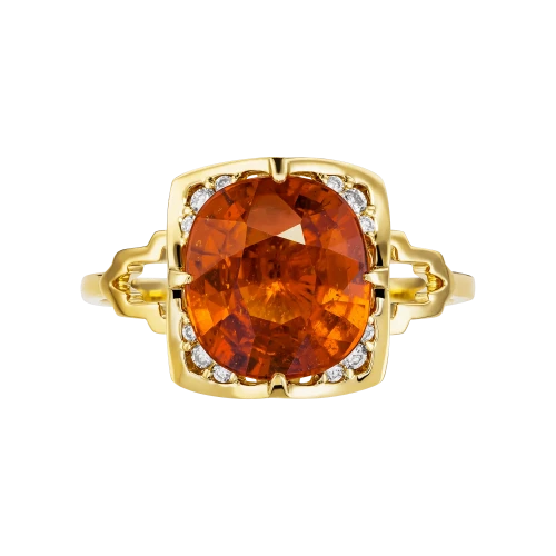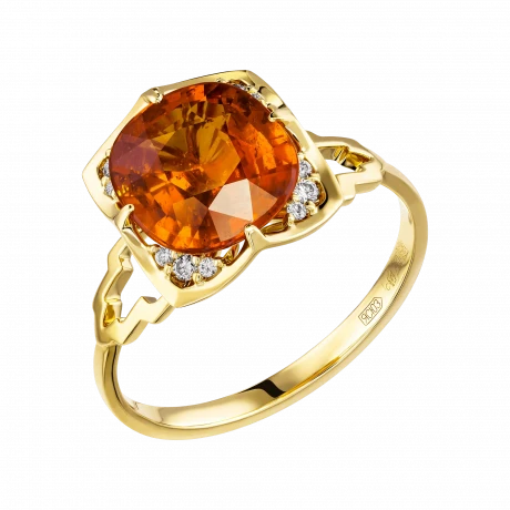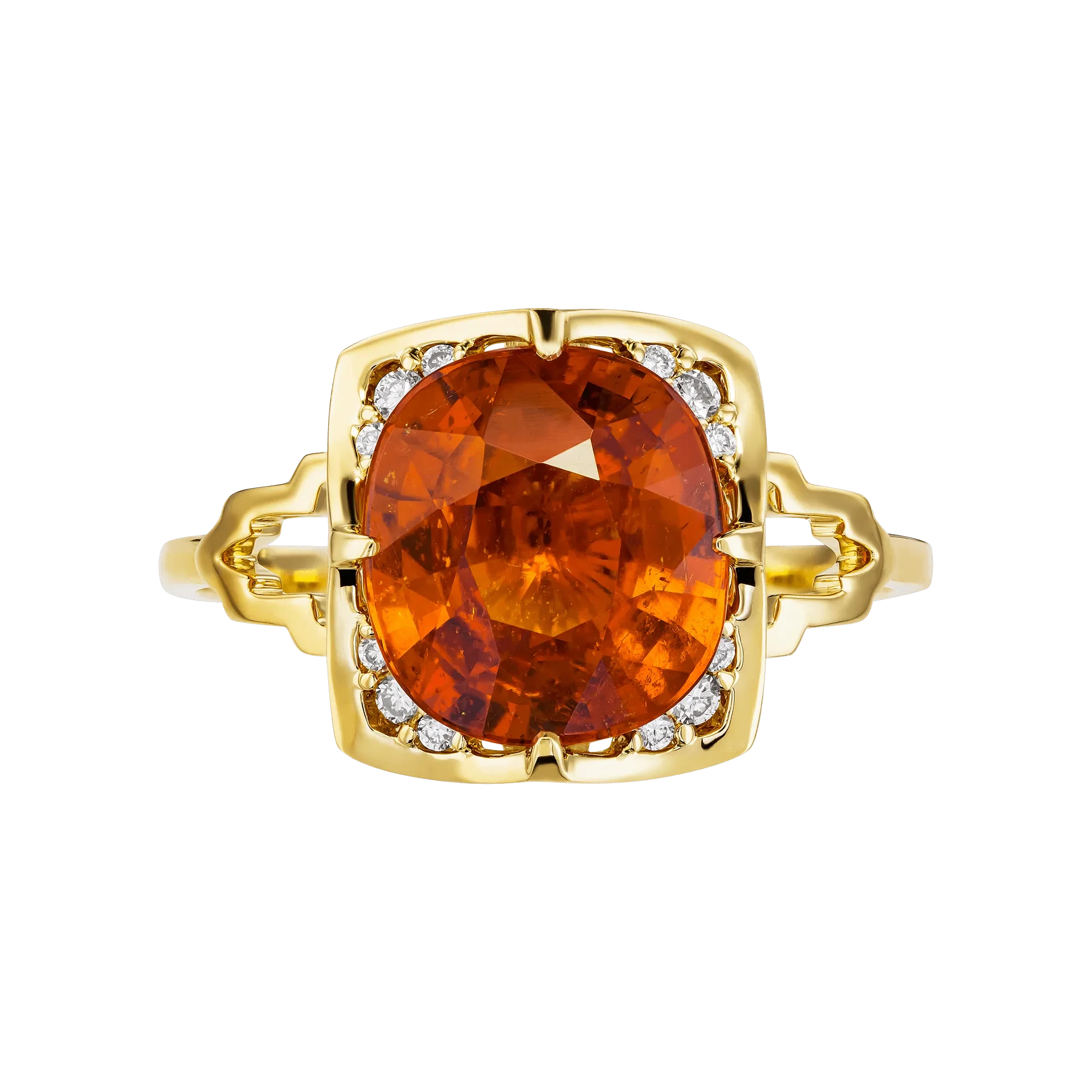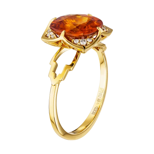 Оправленное в жёлтое золото, сияющее подобно солнечным лучам, украшение подчёркнуто мерцающими бриллиантами, подобными искрам, вырывающимся из живого пламени. Они усиливают сияние спессартина, превращая кольцо в гармоничный символ силы, тепла и вдохновения.