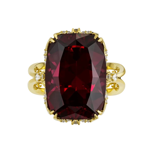 В центре композиции — танзанийский родолит, драгоценный камень с редкой цветовой природой. Его оттенок объединяет густой гранатовый тон с винными и огненными нюансами, проявляющимися при смене освещения. Родолиты из Танзании высоко ценятся за прозрачность и активную световую отдачу: внутри камня словно движется тёплый поток, формируя глубину и живость цвета. Подобная выразительность делает родолит статусным выбором для украшений с сильной индивидуальностью.