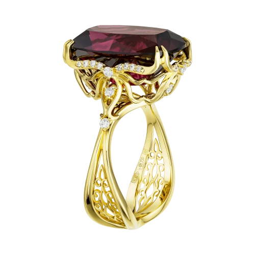 Жёлтое золото оправы усиливает природную теплоту самоцвета и создаёт ощущение цельности образа. Архитектура кольца выстроена уверенно и точно: форма подчёркивает масштаб центрального камня, а бриллианты добавляют выверенные световые акценты, словно фиксируя движение цвета.