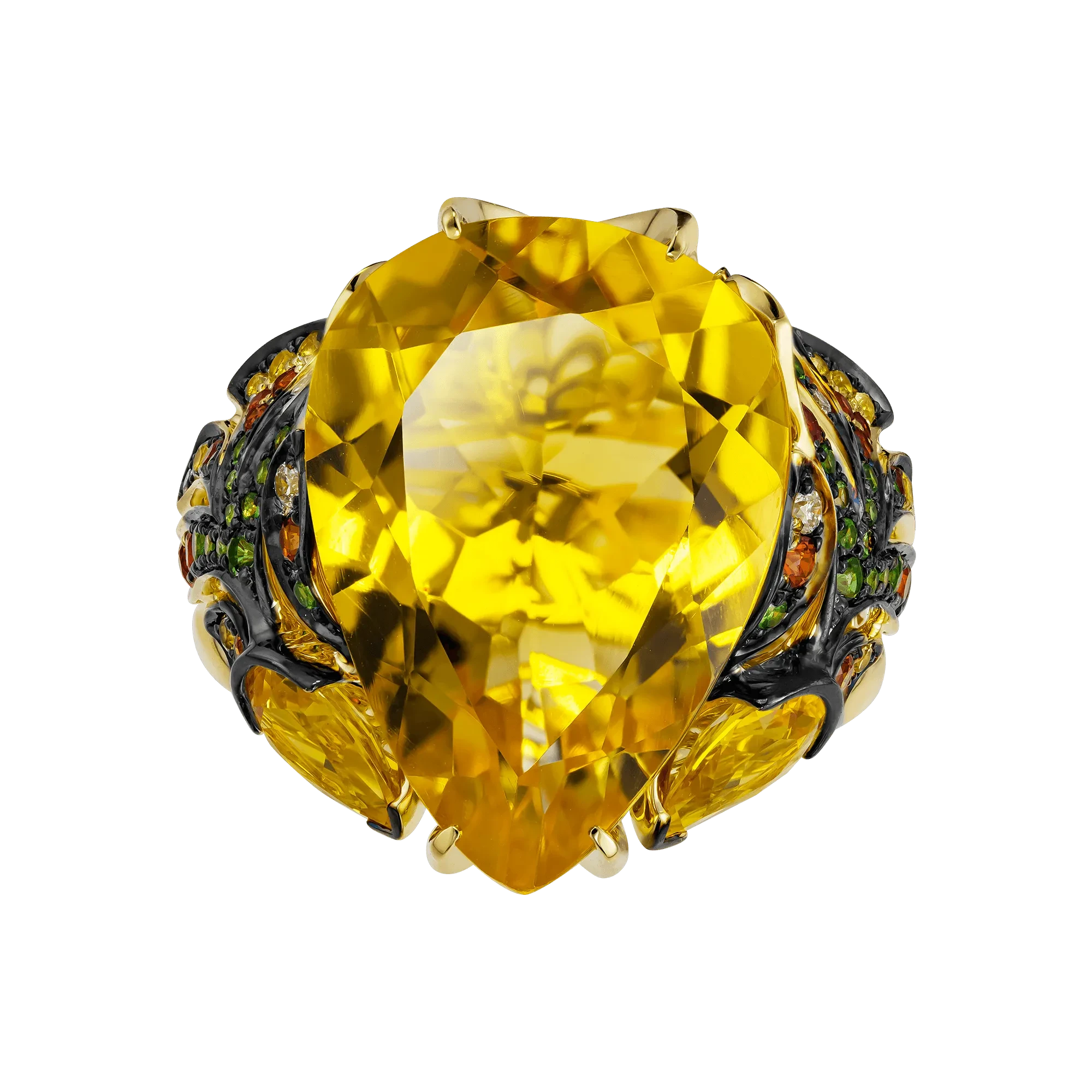 По бокам центральный цитрин поддерживают две стилизованные золотые рыбки — тонко проработанные, инкрустированные бриллиантами, цветными сапфирами и тсаворитами. Они образуют динамичную композицию, где движение направлено к центру, словно оберегая и усиливая его энергию. Кольцо из коллекции Animals становится не просто украшением, а талисманом удачи, изобилия.