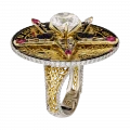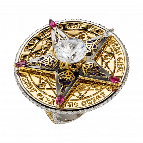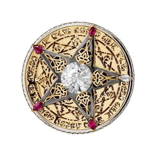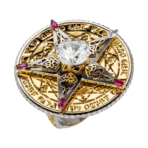 Вращающаяся звезда, закреплённая на оси кольца, задаёт динамику всей композиции и становится ключевым символом непрерывного движения. Акцентные рубины на её лучах вносят энергию и силу импульса, тогда как прозрачный сапфир отвечает за равновесие и устойчивость, формируя гармоничное взаимодействие эмоции и разума.