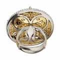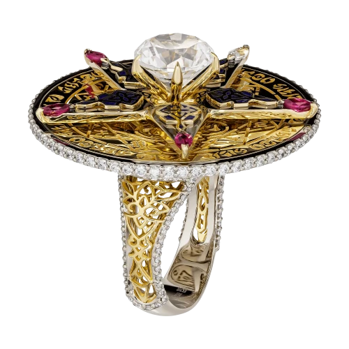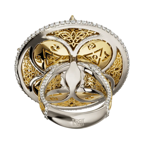 Комбинация белого и жёлтого золота выстроена с архитектурной точностью: холодный металл подчёркивает графику и ясность формы, тёплый — добавляет глубину и пластичность линиям. Декоративные иероглифы на опоре кольца завершают образ, отсылая к древним системам знания и символике скрытых смыслов, доступных лишь тем, кто умеет их читать.