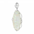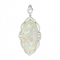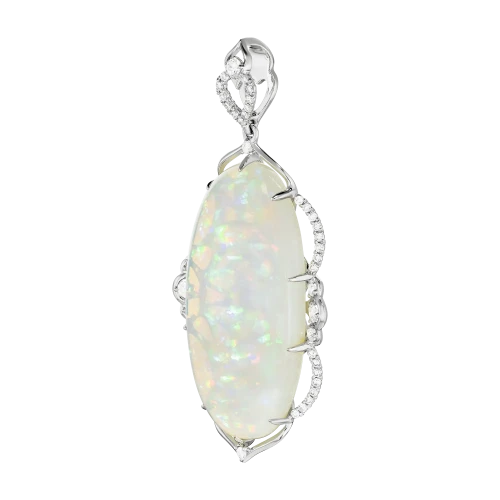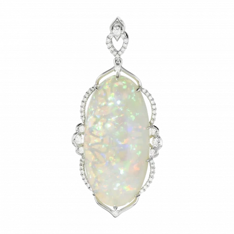 Украшение воспринимается как ювелирная миниатюра о гармонии света и формы — сдержанная, интеллектуальная и безупречно выверенная. В центре композиции — редкий австралийский опал весом 20,27 карата, отличающийся сложной внутренней структурой и богатой игрой оттенков.