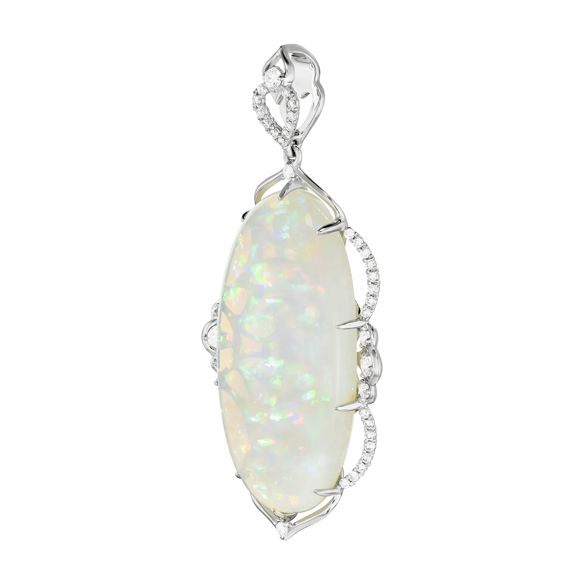 Ажурная оправа из белого золота выстроена как изящная архитектурная рама, точно повторяющая силуэт опала. Бриллиантовая линия образует тонкий световой контур, усиливающий ощущение лёгкости и чистоты образа. На внутренней стороне украшения размещена фирменная монограмма Maxim Demidov — деликатный знак авторства, завершающий композицию.