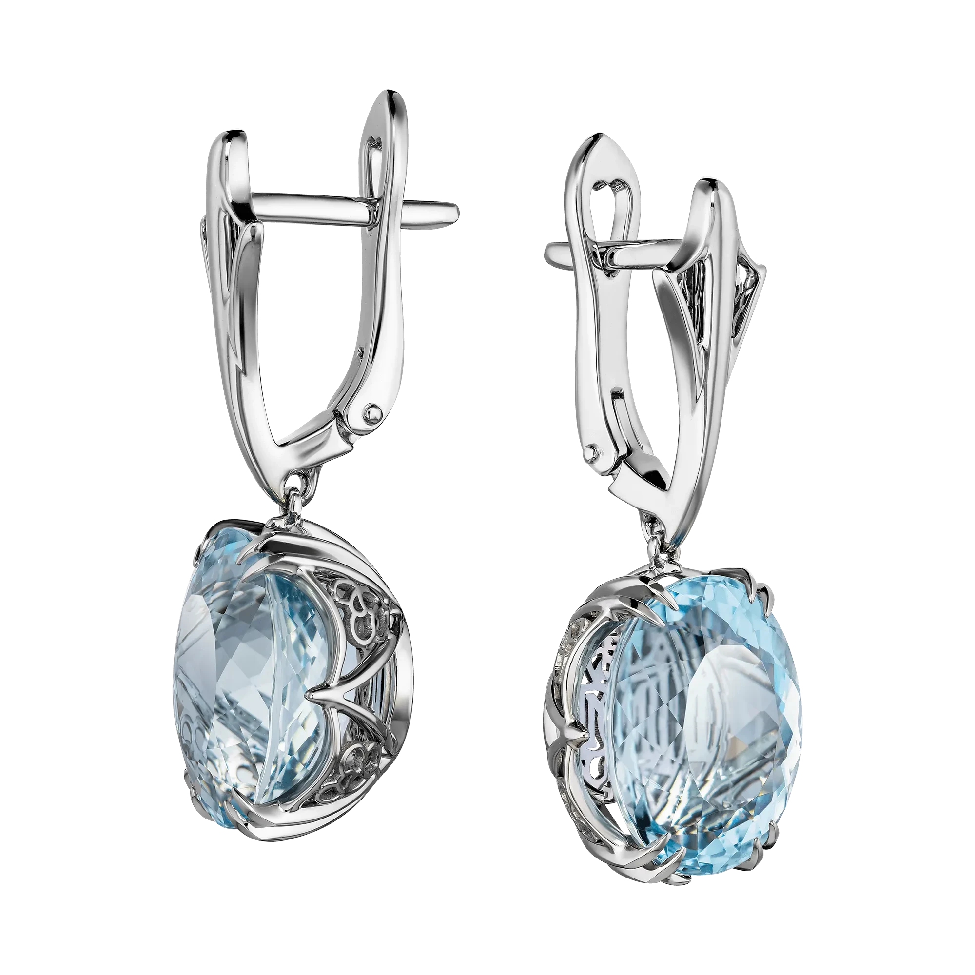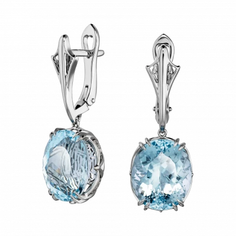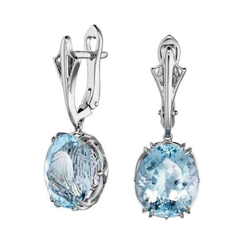 Природные аквамарины из Бразилии, общим весом 11,85 карат, раскрывают чистейший голубой оттенок с лёгким внутренним сиянием. Их овальная форма подчеркивает естественное движение света, а игра граней при каждом повороте создаёт ощущение живого перелива. Белое золото оправы не отвлекает – наоборот, подчёркивает воздушность, прозрачность и целостность композиции, сохраняя ювелирную строгость и эстетику.
