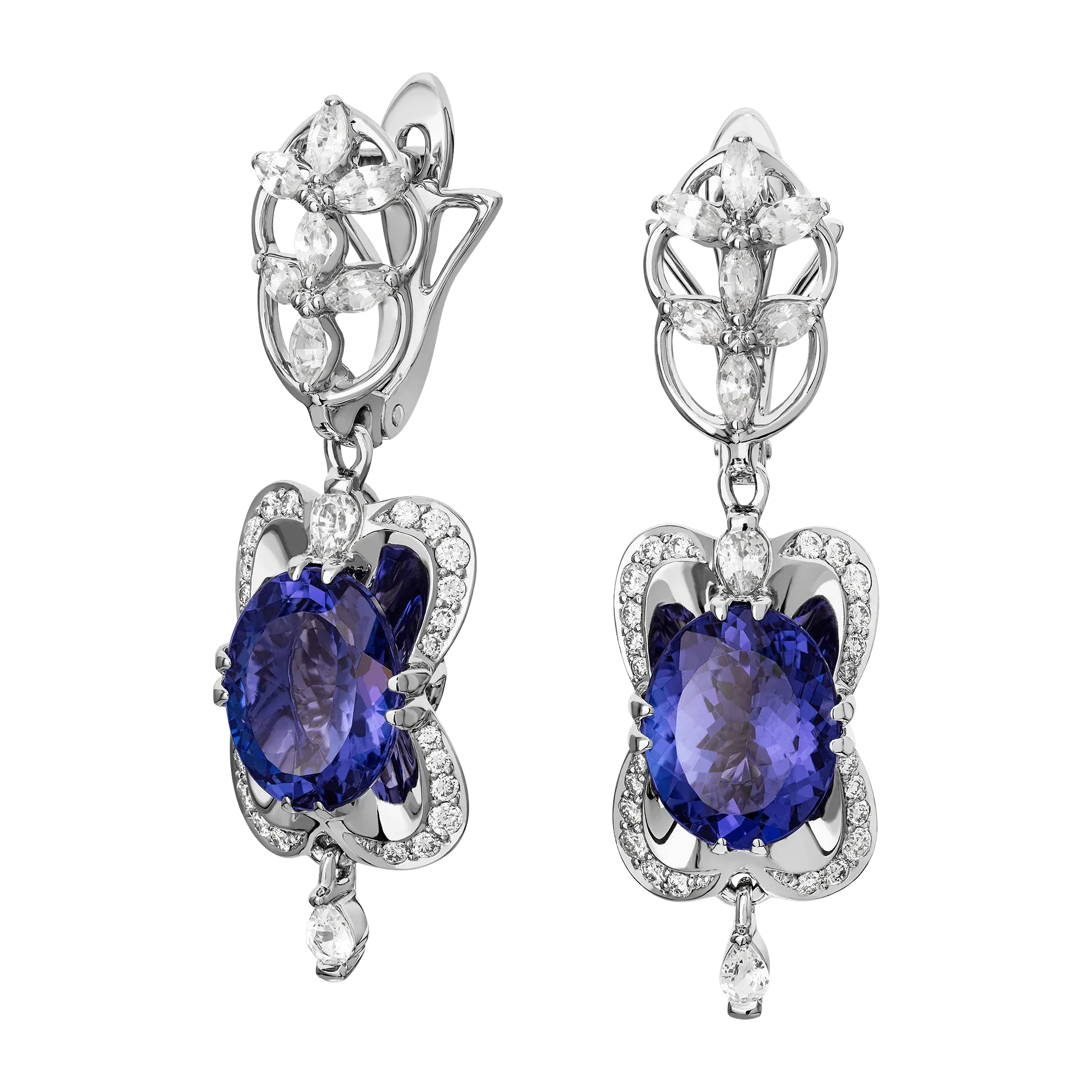 В центре композиции сияют танзаниты глубокого сине-фиолетового оттенка, заключённые в зеркальные чаши из белого золота. Свет, отражаясь внутри оправы, многократно усиливает их внутреннее свечение – словно в драгоценных камнях запечатлён отблеск старинных свечей и тихое дыхание балов прошлого. Цвет танзанитов рождает иллюзию движения, будто они тают в свете, оставляя след – прозрачный и чарующий.