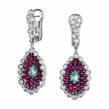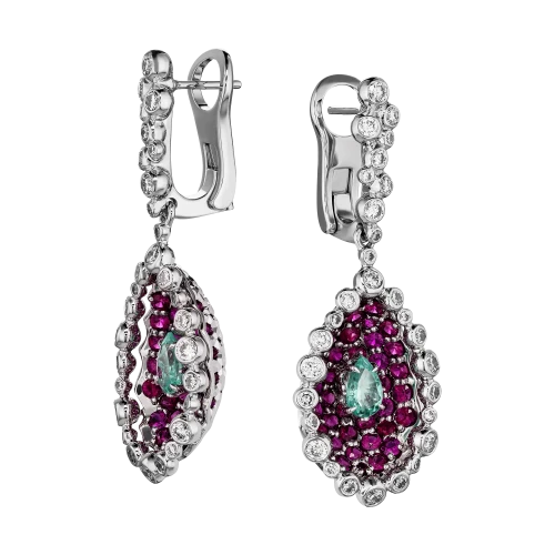В центре композиции – дуэт турмалинов Параиба из Мозамбика общим весом 0,63 карат. Их редкий голубой оттенок с лёгким неоновым свечением буквально врывается в пространство, притягивая взгляд и создавая ощущение внутреннего свечения. Каждый кристалл заключён в чашу из белого золота и обрамлён россыпью рубинов – насыщенных, алых, ярких, словно языки пламени. Этот контраст напоминает о закате, в котором небо и солнце сливаются в пылающем объятии.
