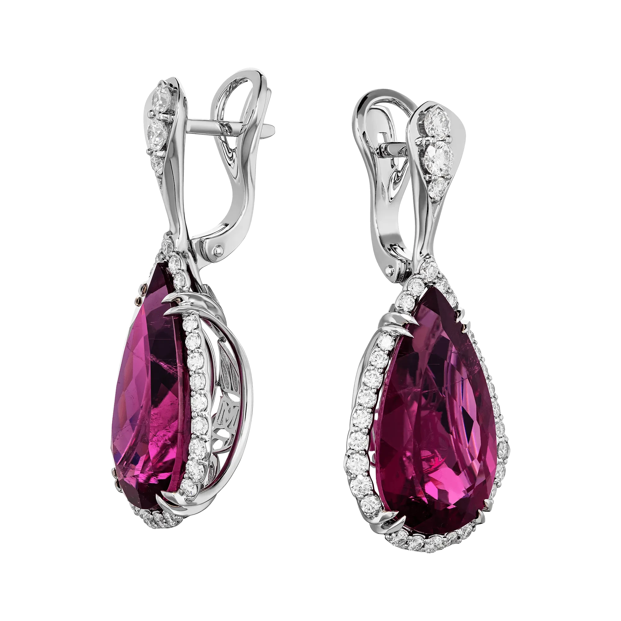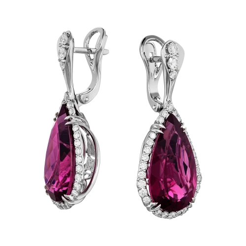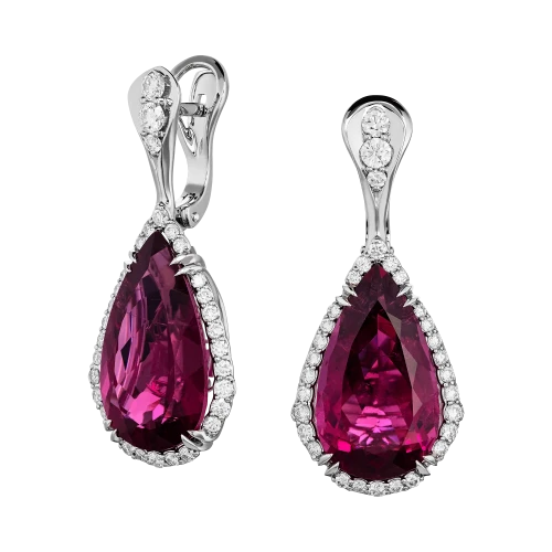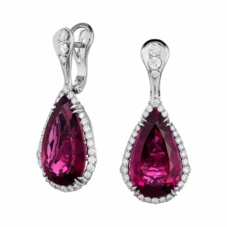 Серьги «Чарующим цветом» продолжают образ, в котором грация соединяется с насыщенной глубиной цвета, а каждый элемент становится визуальной метафорой внутренней силы. Дуэт рубеллитов грушевидной формы, добытые в Бразилии, обладают исключительным пурпурно-гранатовым оттенком – густым, бархатистым, с винной плотностью и оптической глубиной, которая сохраняется при любом освещении. Общий вес пары 23,74 карат, и каждая грань драгоценных камней отражает не только свет, но и характер своей обладательницы.