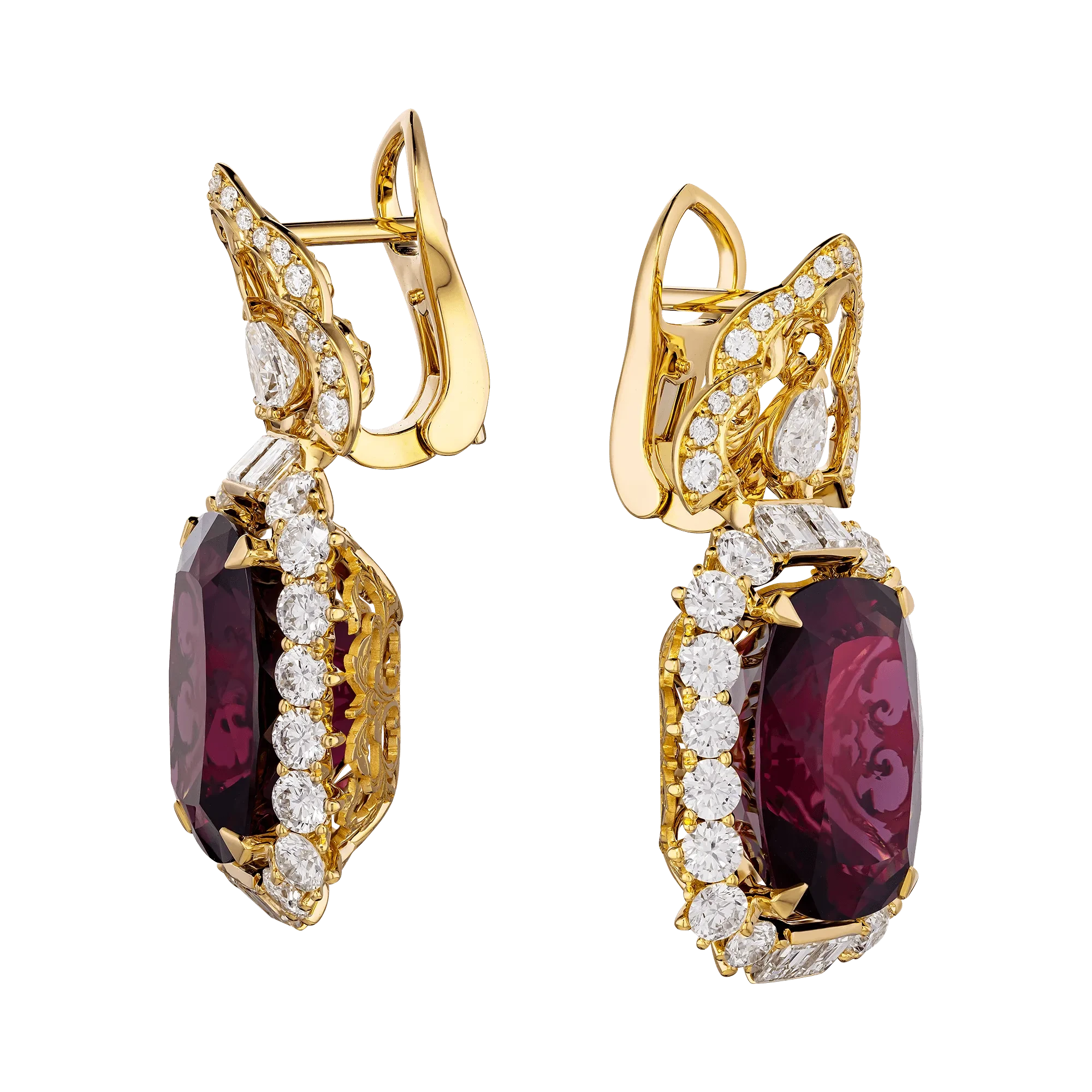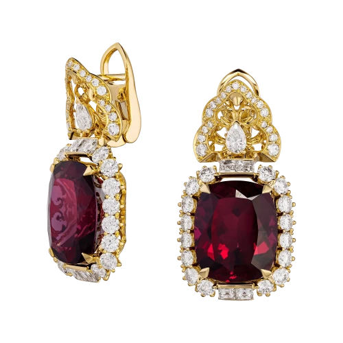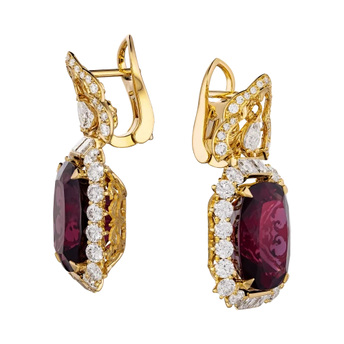 Нижняя часть композиции удерживает родолиты общим весом 28,44 карат – глубокие по цвету, чувственные, насыщенные жизнью. Они не просто завершают форму, а становятся её сердцем, придавая украшению характер и ритм.