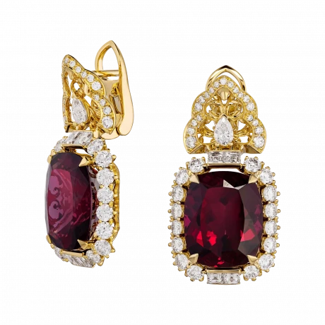 Серьги раскрывают тему восточного великолепия, обращаясь не к яркому сиянию, а к тайне, сокрытой за полупрозрачными тканями и приглушённым светом масляных светильников. Здесь, в каждой линии, в каждом изгибе угадывается язык орнаментов — восточный, древний, пронизанный уважением к форме и её символизму.