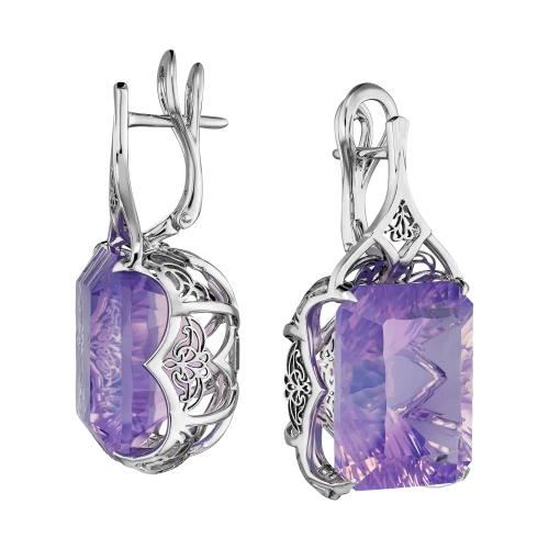 Необычная огранка позволяет свету свободно проходить сквозь природные камни, проявляя тонкое кружево линий оправы из белого золота. Металл не доминирует, а словно вплетён в структуру украшения, поддерживая аметисты деликатно и точно, создавая ощущение невесомости и пространственной чистоты. Серьги выстроены так, чтобы сохранять баланс между масштабом камней и лёгкостью восприятия.
