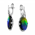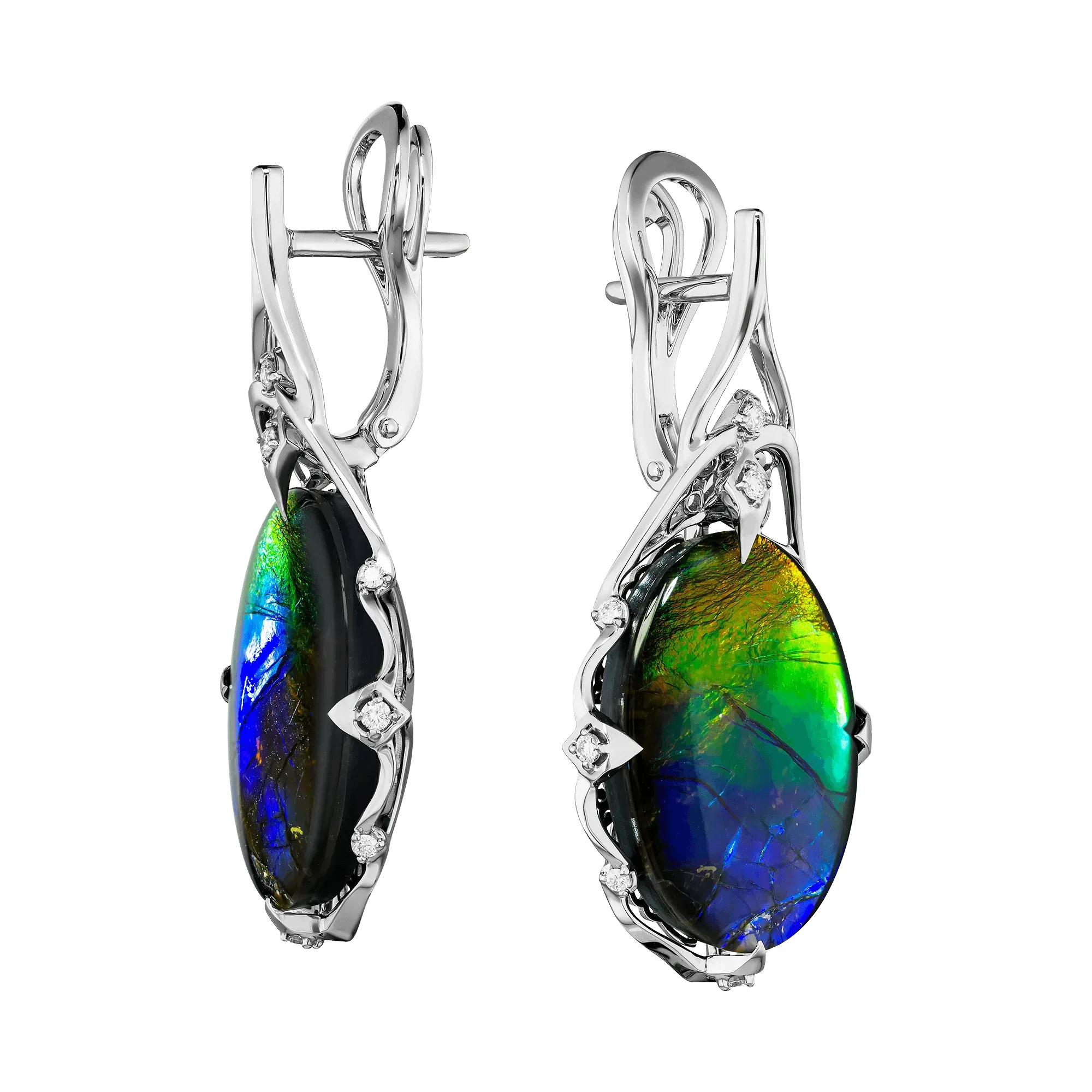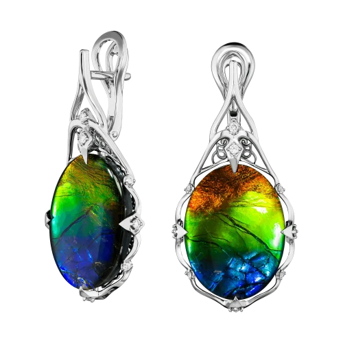Аммолиты обладают исключительной оптической природой: их цвет рождается не из пигмента, а из многослойной структуры арагонита, которая разлагает свет на спектры. При каждом движении серьги оживают — в камнях сменяются зелёные, синие, золотистые и огненно-красные переливы, создавая эффект живой, текучей хроматики. Такая иризация делает каждый аммолит абсолютно неповторимым, а каждую пару серёг — уникальной по характеру и световому рисунку.