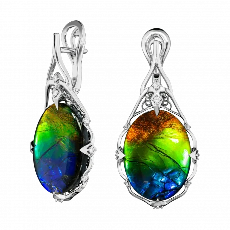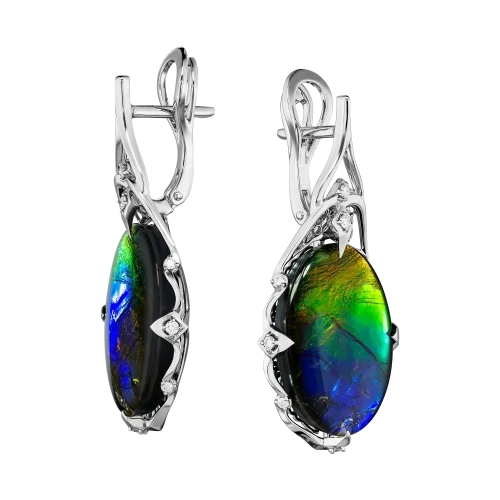 Иногда украшение становится не продолжением образа, а его глубинным смыслом — отражением времени, света и движения, заключённых в редкой материи. Серьги «Хроники света» созданы вокруг уникальных аммолитов — органических самоцветов, сформированных миллионы лет назад и добываемых исключительно в Канаде, в единственном в мире месторождении этого камня.