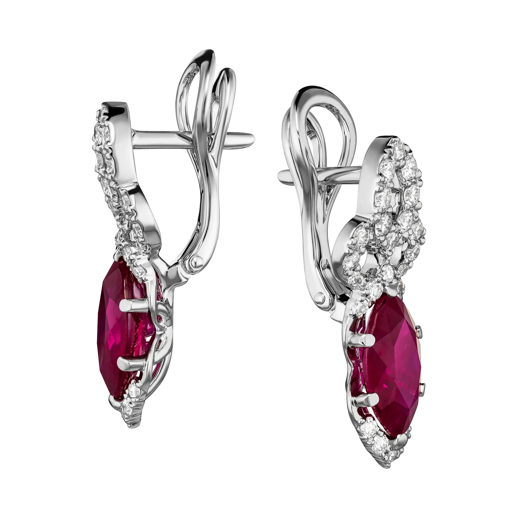 Белое золото, инкрустированное бриллиантами, создаёт ореол сияния вокруг рубинов, усиливая их внутренний свет. Контраст холода и жара превращает композицию в ювелирную симфонию – гармонию, в которой блеск и пламя звучат в унисон.