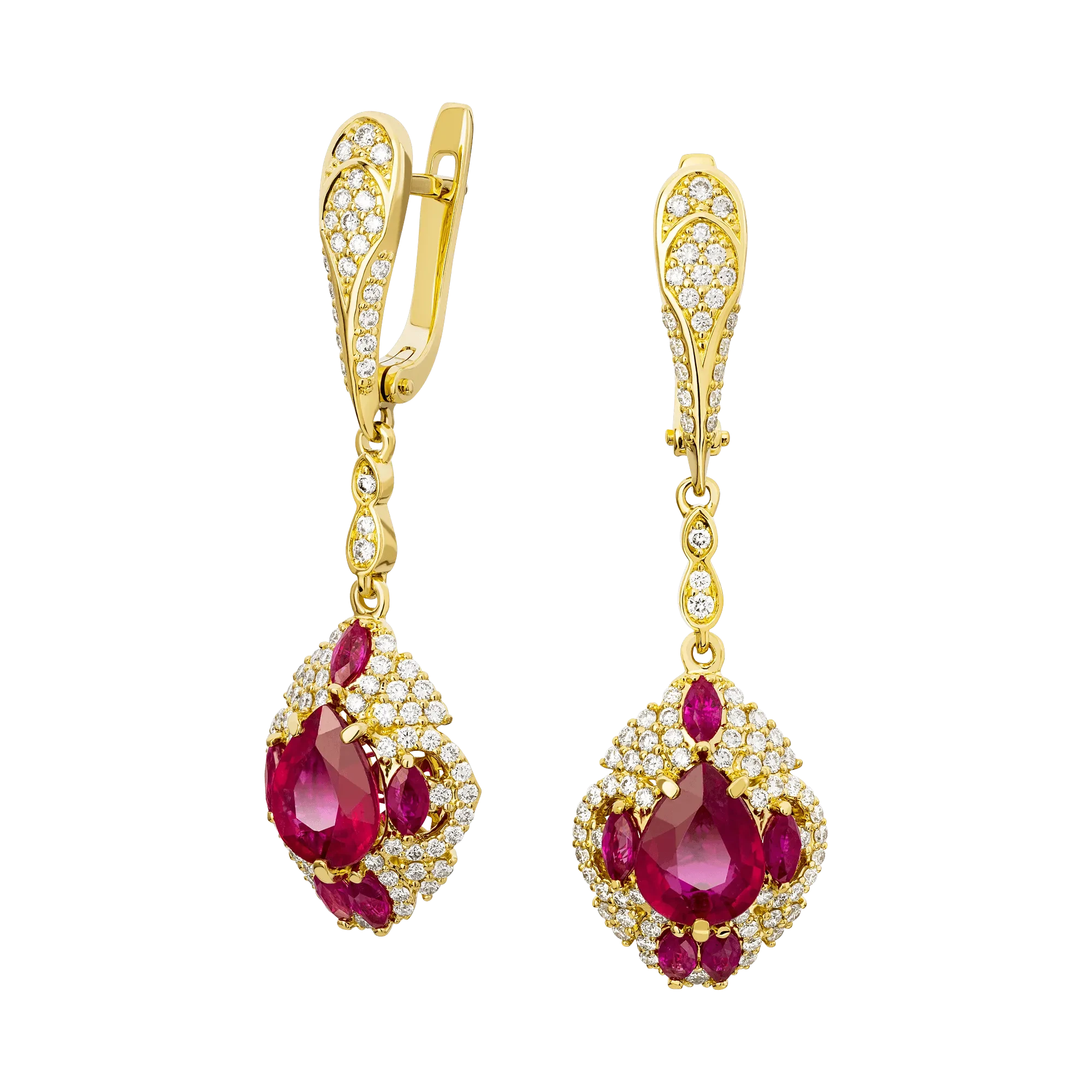 В обрамлении почти ста семидесяти сверкающих бриллиантов, буквально расступившимися перед сочными корундами, центральные кристаллы неистово горят животворящим блеском, «запуская» магическую силу эксклюзивных серег, способных как завершить образ владелицы, так и стать главным акцентом ее наряда.
