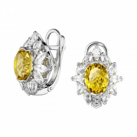 Бразильские цитрины тёплого солнечного оттенка раскрываются в ритме, где цвет воспринимается не вспышкой, а протяжённостью. Их сияние мягкое и ровное, без резких переходов, словно свет, который сопровождает движение, не меняя своей плотности. Белые сапфиры и бриллианты выстраивают вокруг камней чистое световое поле, добавляя глубину и сохраняя ощущение прозрачности и воздуха.