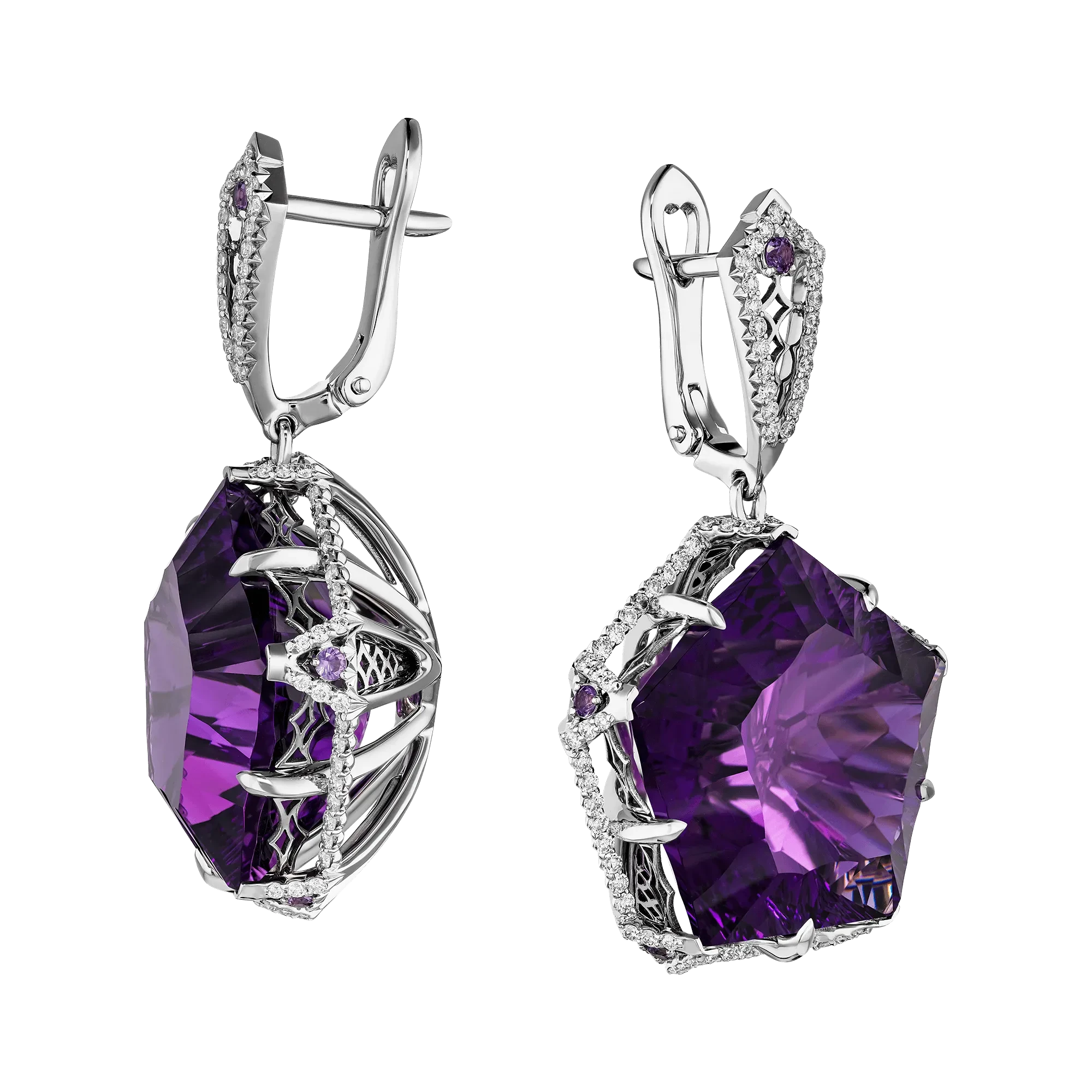 Обрамление из бриллиантов и пурпурно-фиолетовых сапфиров усиливает глубину и насыщенность природных камней, создавая игру света, подобную солнечным бликам на мраморных фасадах соборов. Белое золото оправы завершает композицию, подчёркивая графичность линий и превращая серьги в изысканный символ гармонии.