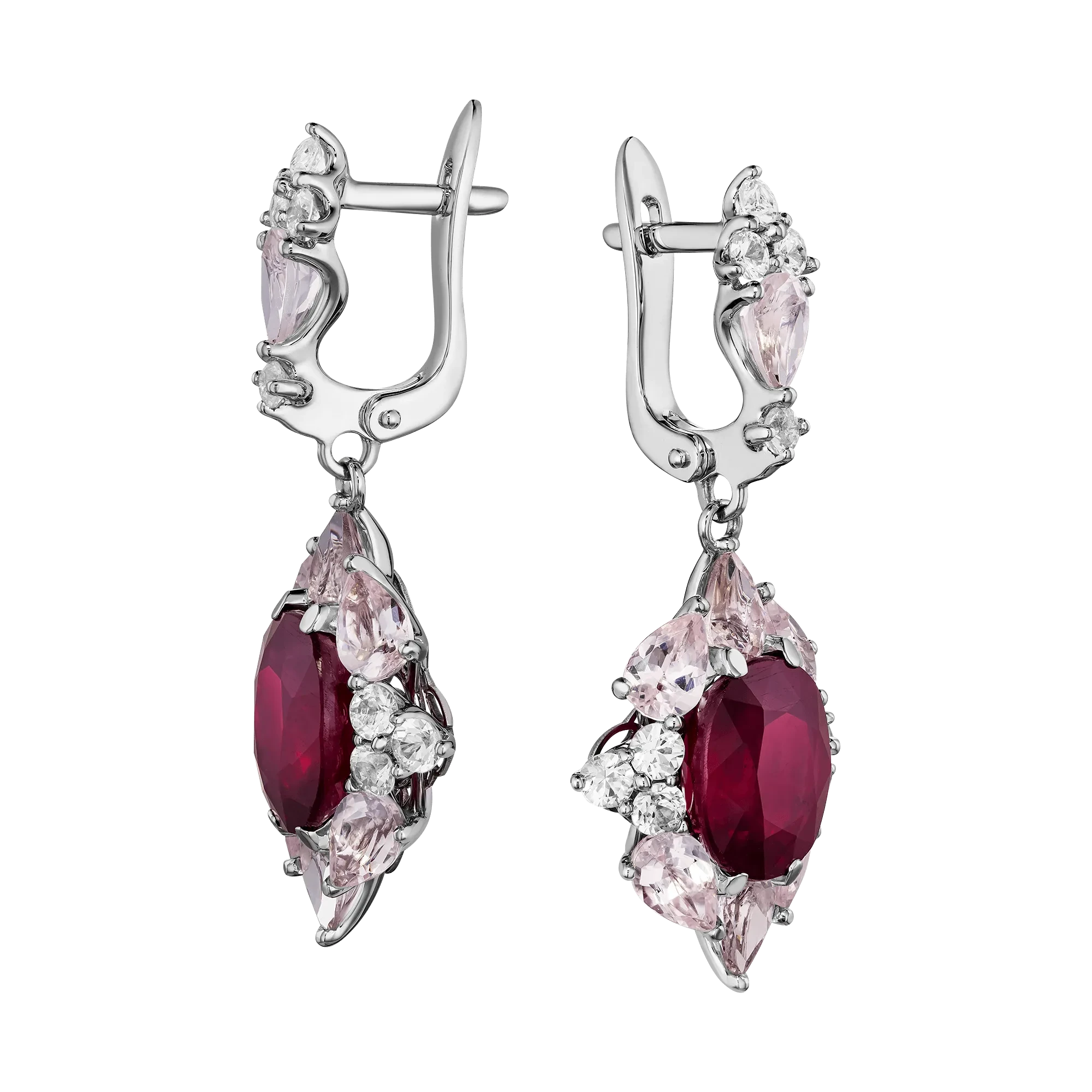 Вокруг сияют мягкие розовые морганиты и чистые белые сапфиры, создавая утончённую палитру, где тёплые и холодные тона переплетаются, усиливая глубину и объём центральных камней. Их блеск напоминает всполохи рассвета, отражённые на драгоценных гранях.