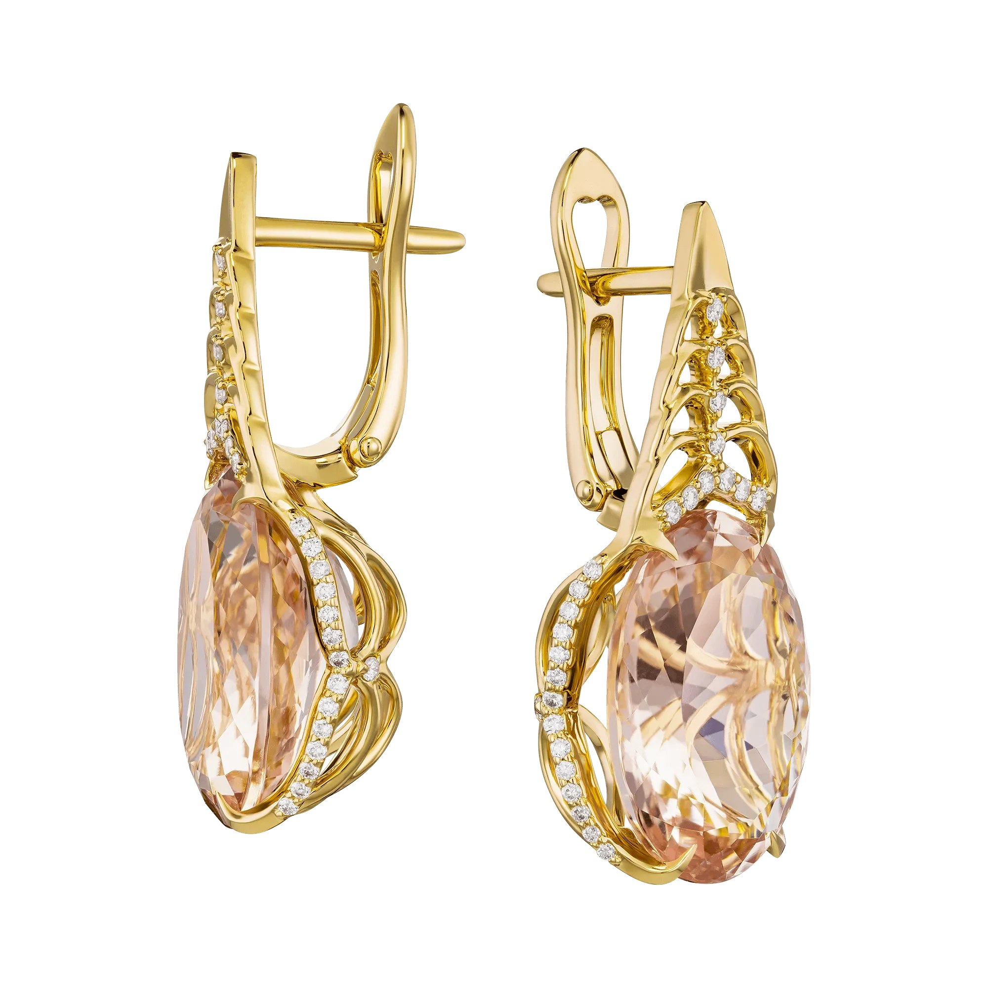 Жёлтое золото оправы и россыпь бриллиантов создают ауру лёгкости и изящества, подчеркивая природное очарование морганитов. Серьги становятся поэтическим образом мечты, которая озаряет путь мягким светом, превращая каждый шаг в танец с вечностью.