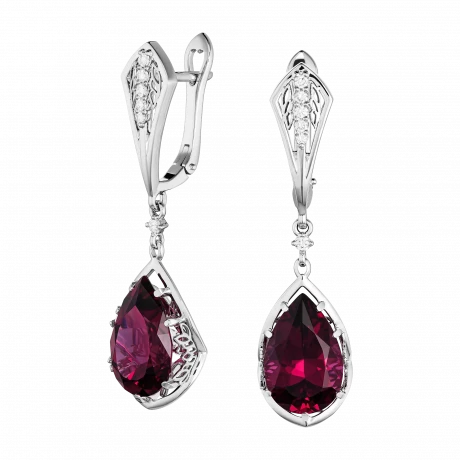 Родолиты из Танзании, ставшие центральными акцентами серёг, отличаются насыщенным винно-пурпурным оттенком и высокой чистотой. Камни этого происхождения ценятся за плотность цвета и умение удерживать свет внутри кристалла. Огранка подчёркивает глубину оттенка, делая его спокойным, уверенным и визуально устойчивым.