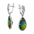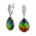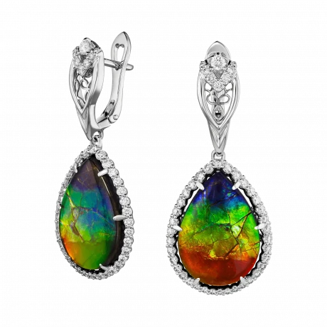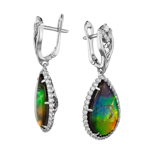 Оправы из белого золота, украшенные бриллиантами, обрамляют аммолиты сияющим ореолом, усиливая глубину цвета и подчёркивая природную сложность рисунка. Свет в подвижных серьгах словно пульсирует, напоминая о вечном дыхании океанов.