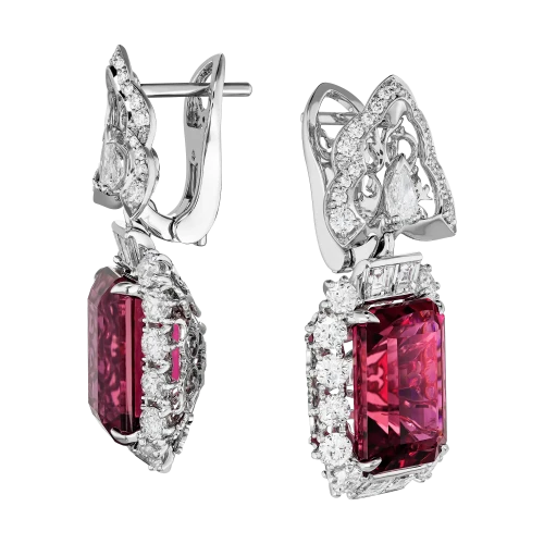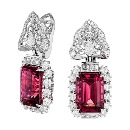 Парадные серьги «Пышность дворцовых садов» строят образ на эффекте торжественного расцвета — таком, каким его задумывали в регулярных дворцовых садах эпохи барокко, где каждый элемент усиливал ощущение масштаба и величия формы. Центром композиции становятся рубеллиты общим весом 15,39 карата — яркие, насыщенные, безусловно притягательные.