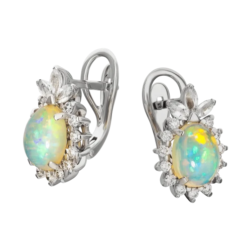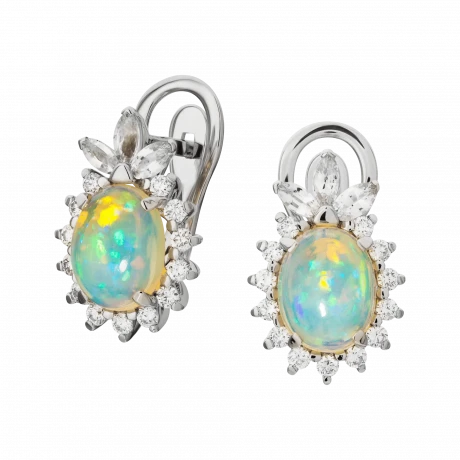 В центре композиции – дуэт эфиопских опалов, поражающих игрой оттенков и переливов. Их опалесценция рождает сотни тонких бликов – от лавандовых и бирюзовых до золотисто-розовых. Драгоценные камни словно живут в постоянном движении, отражая эмоции и настроение своей обладательницы.