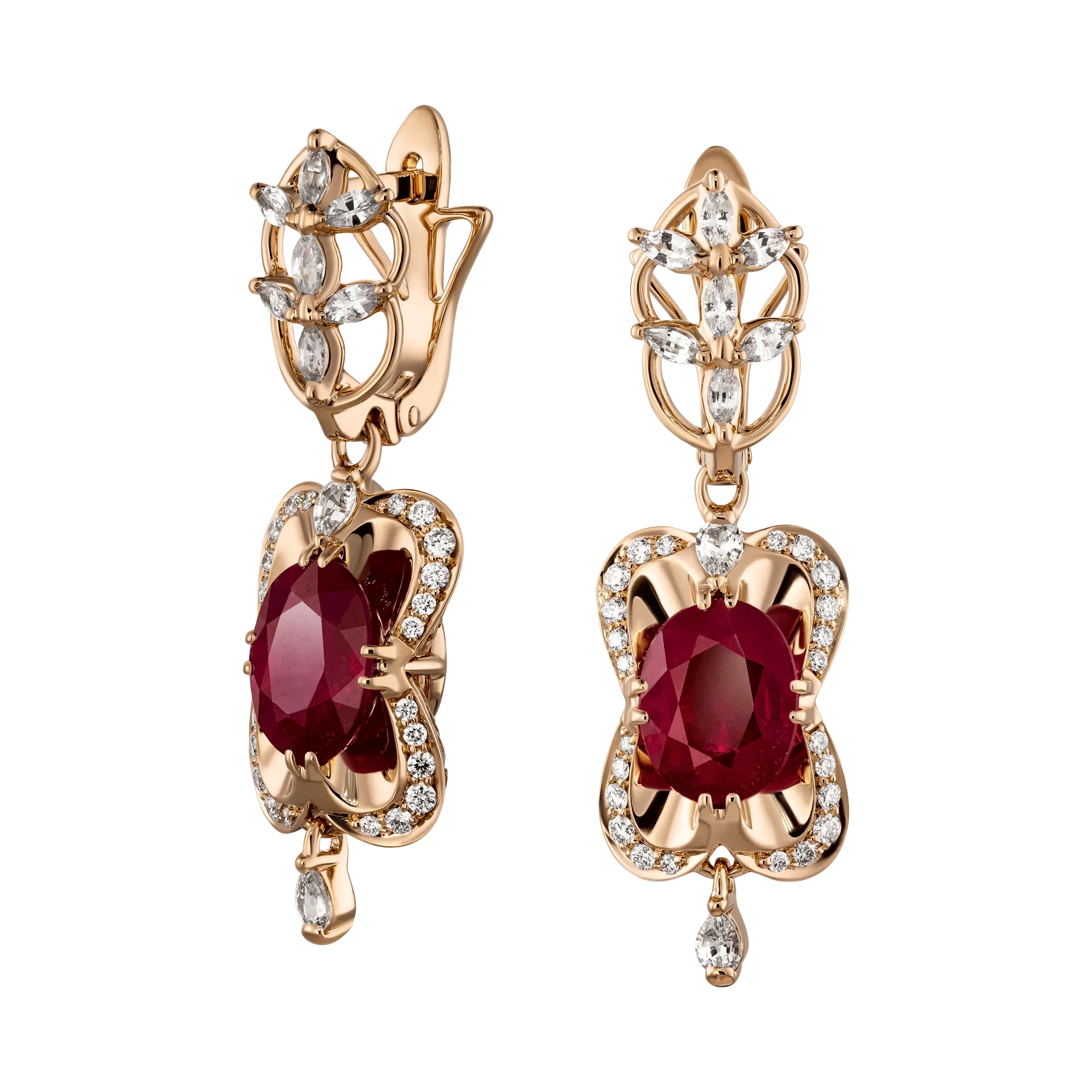 Страстная, всеобъемлющая сила драгоценности затягивает и моментально покоряет при визуальном контакте, будто пылкое искреннее признание, перед которым невозможно устоять. В эмоциональной структуре авторского украшения главное место мастера отвели двум сочным рубинам общим весом 4,91 карат. Глубинная чистота и яркая наружная экспрессия, выраженная в насыщенном цвете минералов, идеально сочетается со сверкающим великолепием обрамляющих бриллиантов и сапфиров.