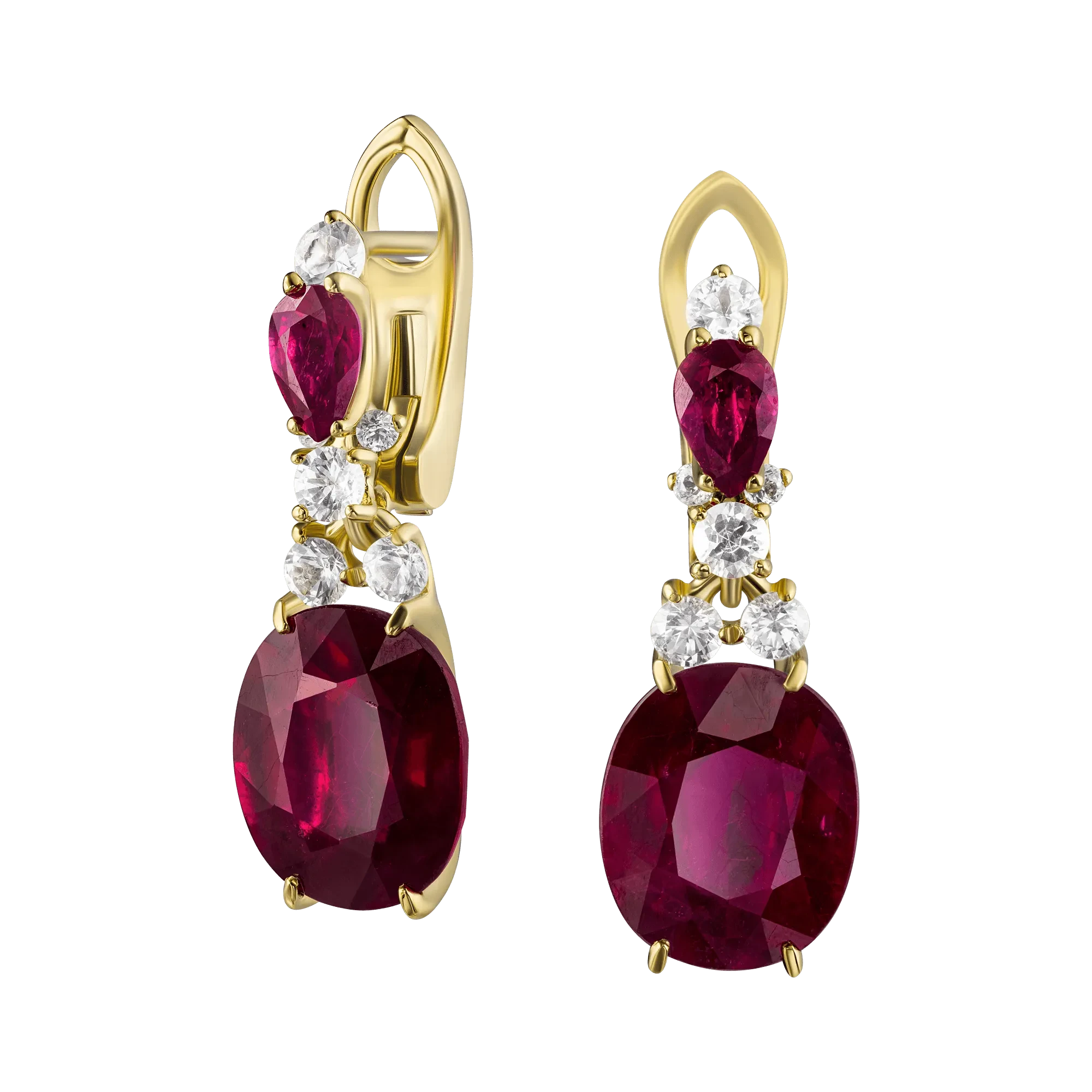 Чтобы прекрасная дама могла владеть своим собственным пламенем, никогда не гаснущим и особенно ярким при дневном свете, дизайнеры Maxim Demidov сочинили изумительные серьги из желтого золота, в которых пылают сразу четыре рубина – красноречивое олицетворение огненной стихии, чей насыщенный цвет подчеркнут прозрачными сапфирами.