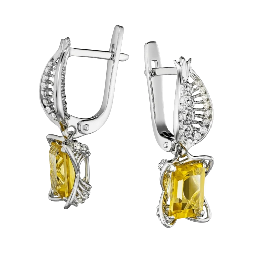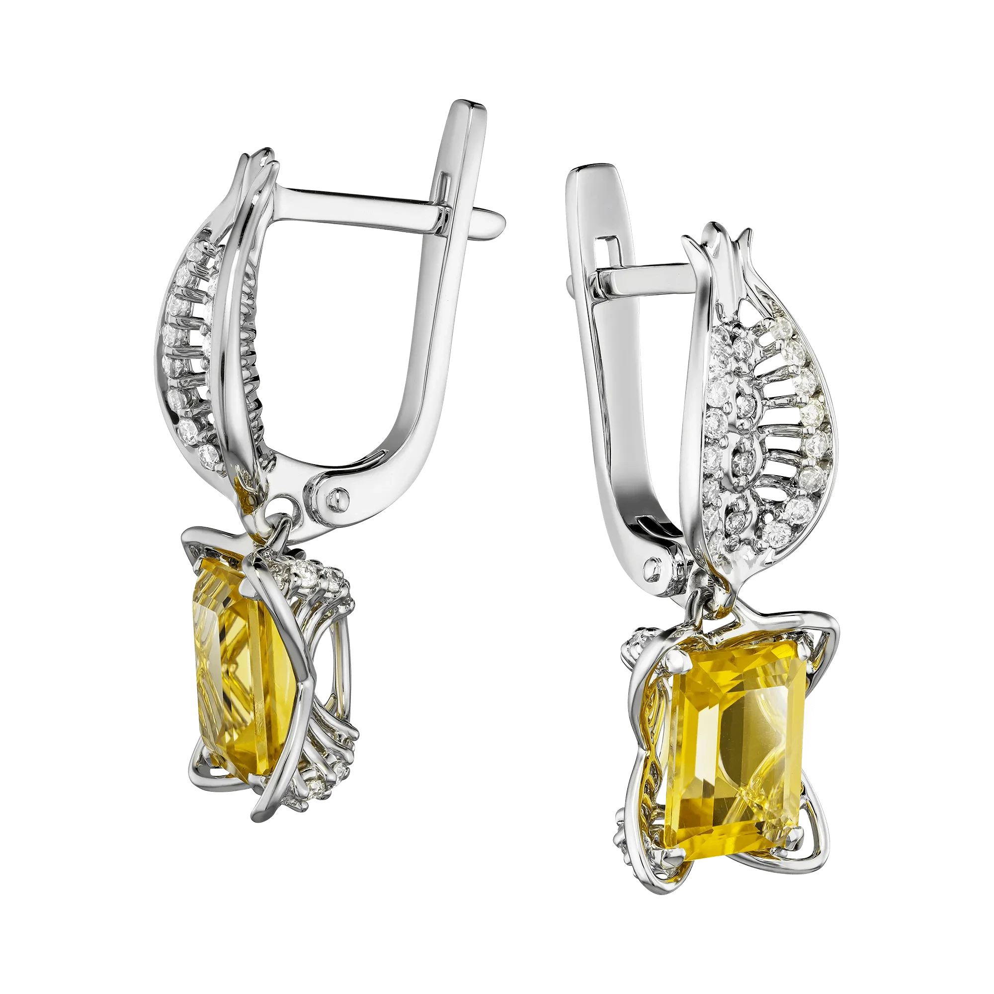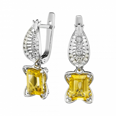 Цитрины медового оттенка проявляют насыщенность постепенно, сохраняя ровное свечение без резких вспышек. Их прозрачность позволяет свету свободно работать с цветом, усиливая глубину и плотность оттенка. Ажурная оправа из белого золота, инкрустированная бриллиантами, формирует световой ритм, в котором оттенок камней становится более выразительным именно за счёт отражений.