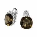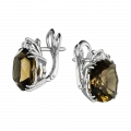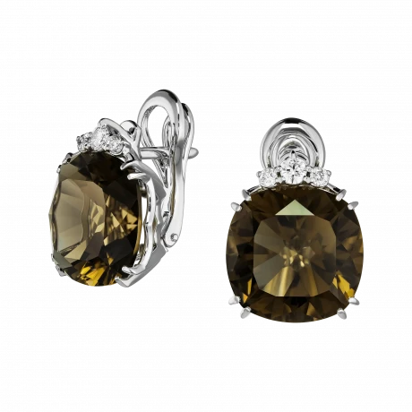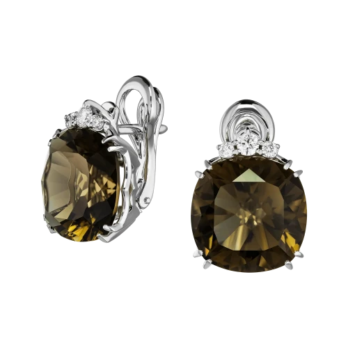 В центре каждой серьги – дымчатый кварц из бразильского Минас-Жерайс, региона, где природа рождает кристаллы с редким, тёплым бронзово-дымчатым оттенком. Камни будто удерживают в себе отблеск заката: их цвет меняется от прозрачного янтарного сияния до густого сумеречного полутона, создавая живую игру света при каждом движении.