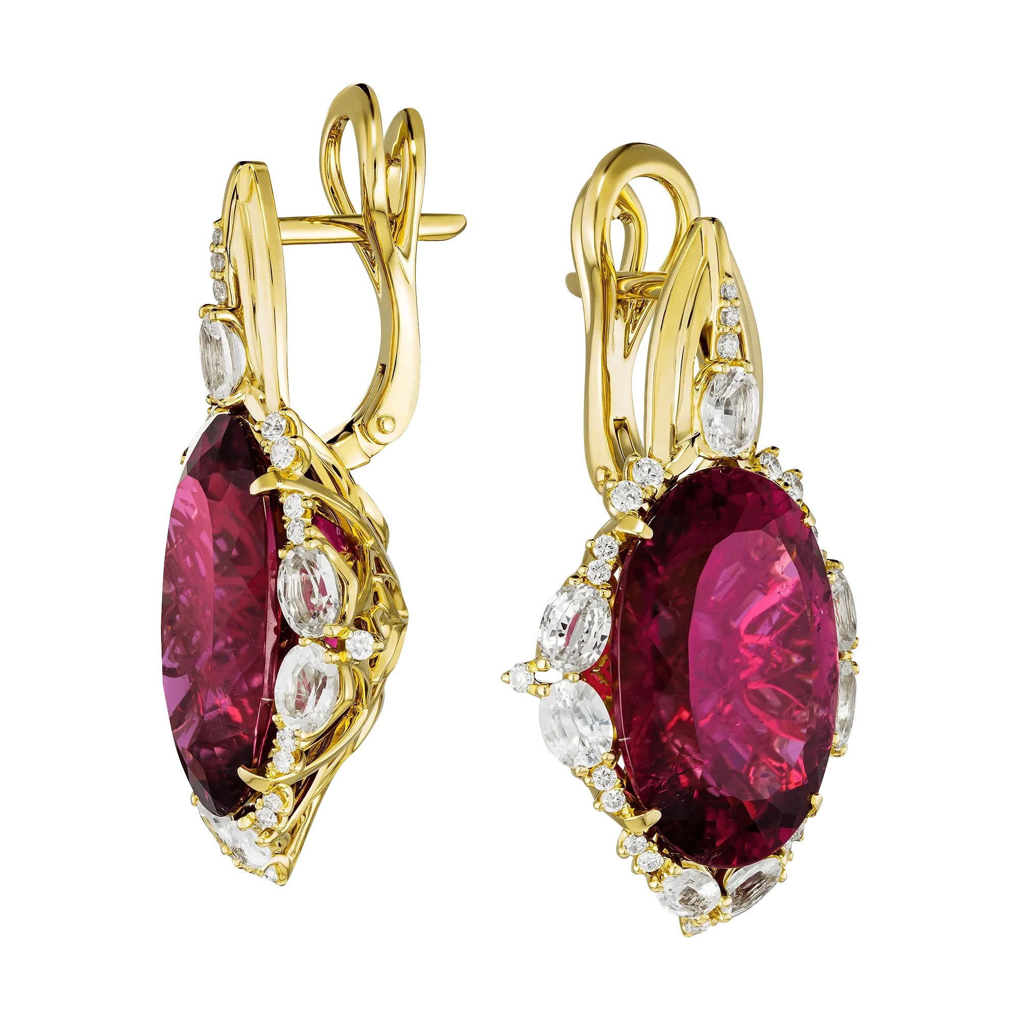 Оправа, выполненная из жёлтого золота и инкрустированная бриллиантами и белыми сапфирами, выстраивает вокруг рубеллитов тонкий световой акцент. Холодное мерцание драгоценных деталей подчёркивает насыщенность центральных камней, усиливая контраст и создавая визуальный ритм, который сопровождает каждое движение.